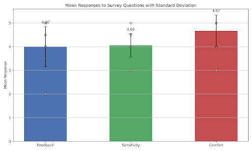 The following bar plot shows the results of this survey. The colored bars indicate the mean response to each question. Error bars are included to represent the standard deviation of the responses, giving a sense of the variability in the data. Additionally, individual responses are overlaid as light gray dots, providing a detailed view of the distribution of all data points. Each bar is labeled with the corresponding mean value to facilitate easy interpretation of the results.
