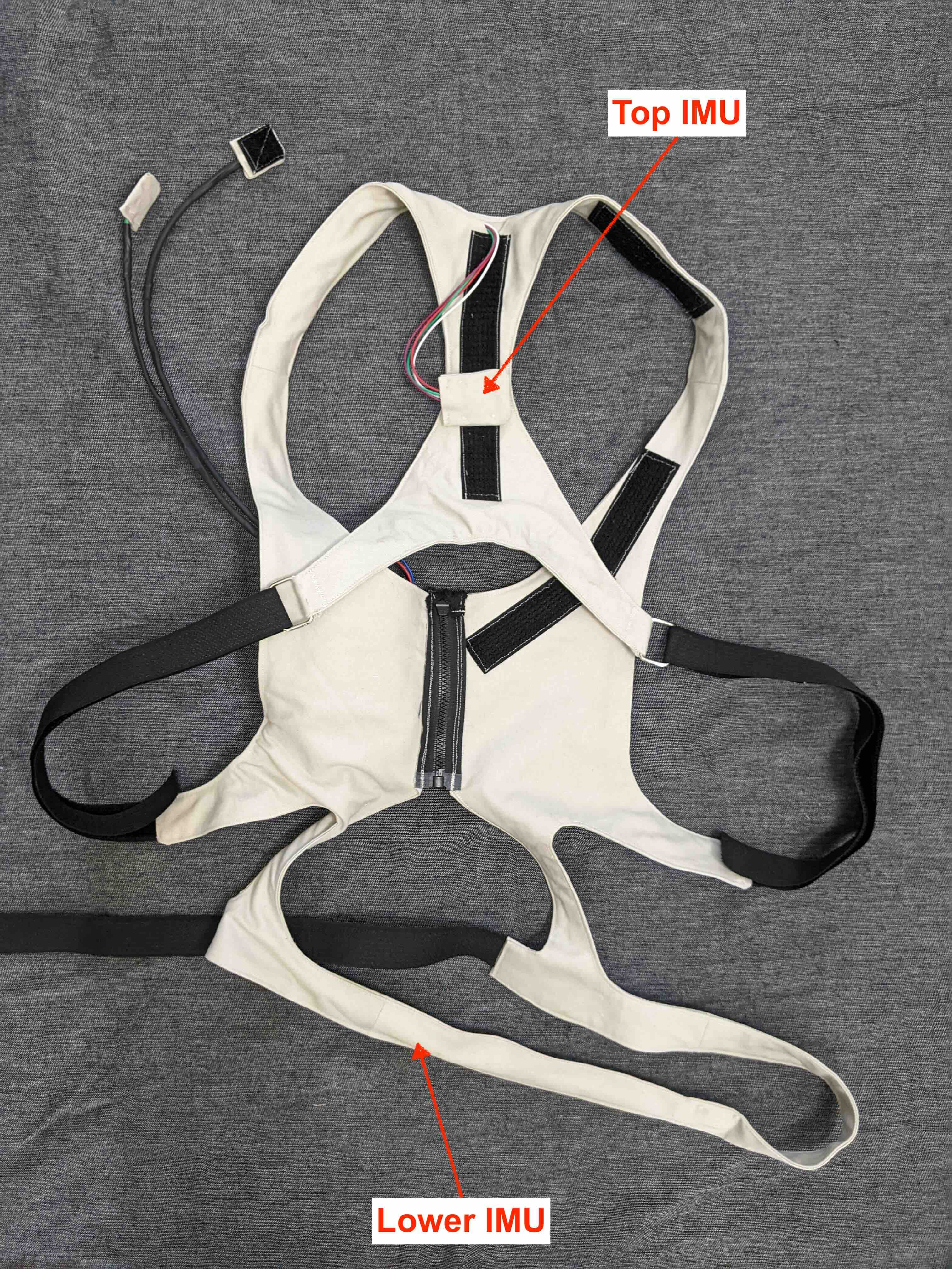 Haptic feedback is provided to the user via two eccentric rotating mass (ERM) motors. One is placed on the front of the vest near the user’s chest, and the other is placed on the vest near the upper back of the user. If the user’s upper back is curved too far forward relative to the lower back, the front ERM is activated. The amplitude of its vibration is proportional to the magnitude of the relative difference between the upper and lower back angles, once this difference is larger than the minimum threshold. A similar proportional vibration feedback is applied to the back ERM for the case when the upper back is curved too far backward relative to the lower back. When the user’s back is bent forward past the absolute limit, both ERMs activate and buzz at the largest amplitude until the user corrects their tilt to fall below the maximum tilt threshold.