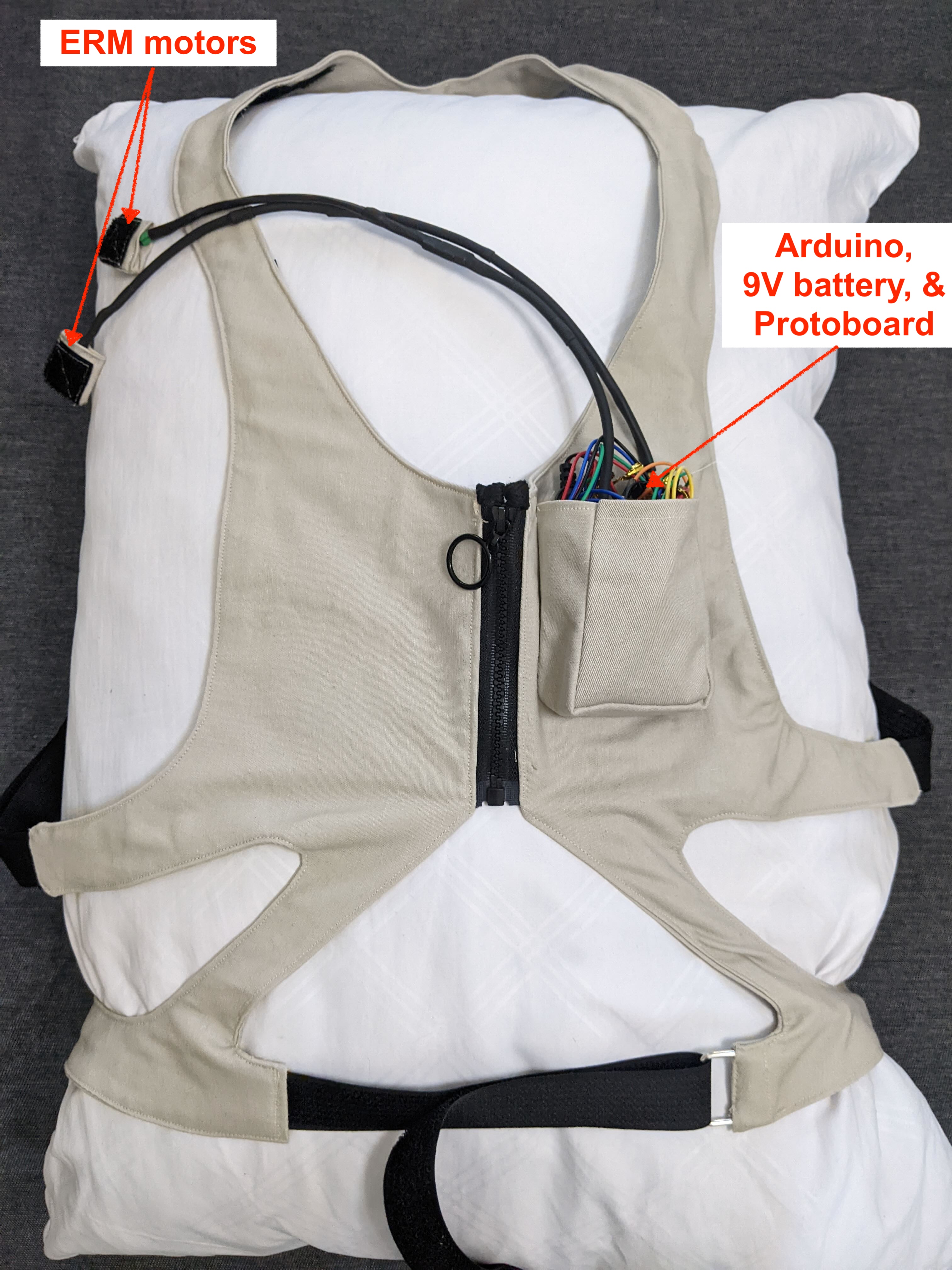 Our electronics are integrated into a wearable and adjustable vest. The vest is custom-sewn and includes pockets to keep the IMUs, ERMs, Arduino, battery, and protoboard secure during operation. Based on the user’s back length, the upper IMU’s position is adjustable through velcro. To keep a neat appearance, the vest also allows for proper cable management between the IMUs and the Arduino.