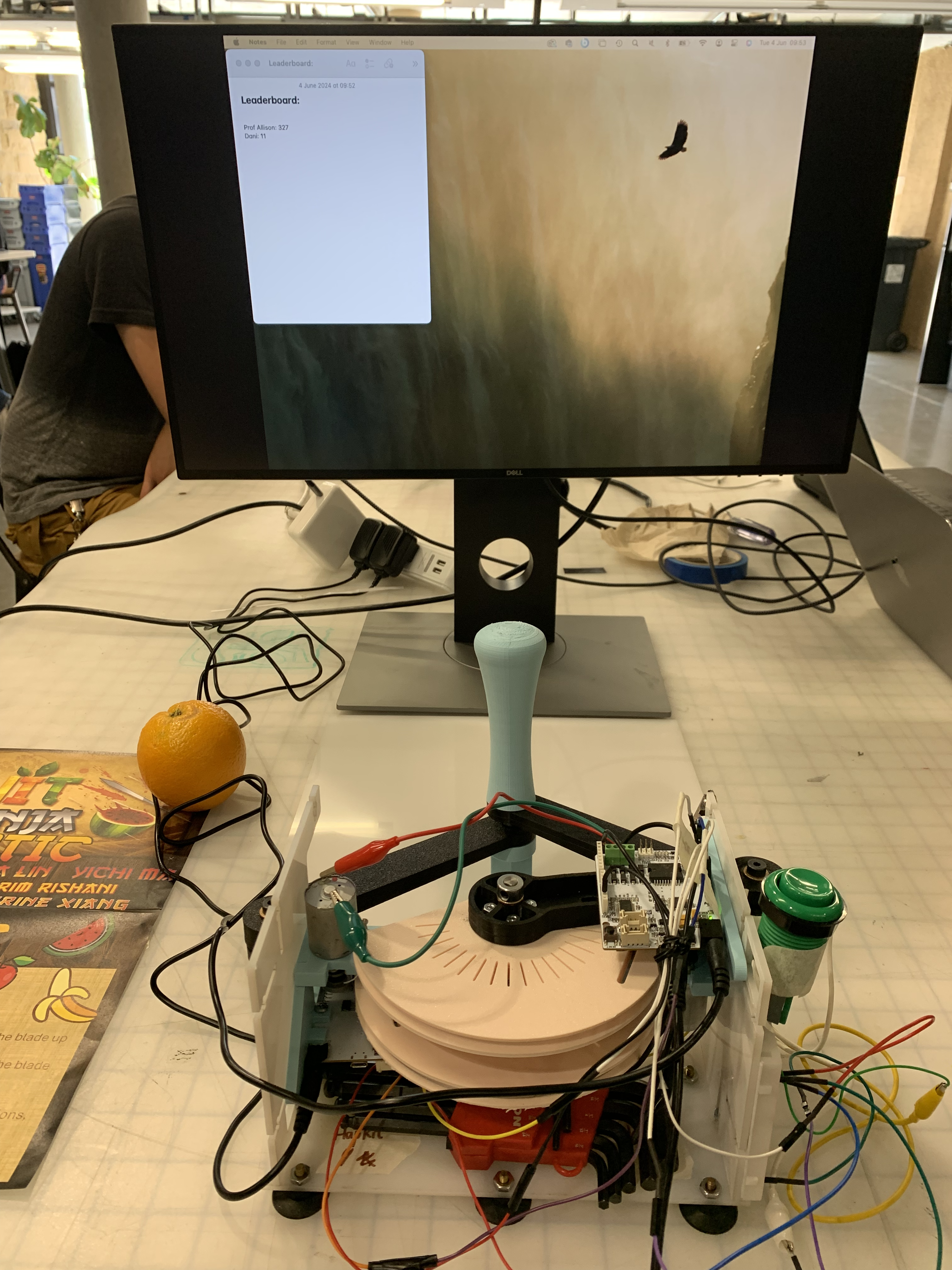 After installing our new sectors, we plan to implement a bounding box within the workspace that will reflect the square “dojo” window shown to the user. Additional force feedback that we need to implement includes the forces felt when chopping a fruit (dependent on the fruit’s velocity vector and the user’s velocity vector), implementing haptic bombs, and a score tracker to count the number of fruits sliced. A longer term goal for us is implementing a variety of fruits with different sizes and force feedback values.