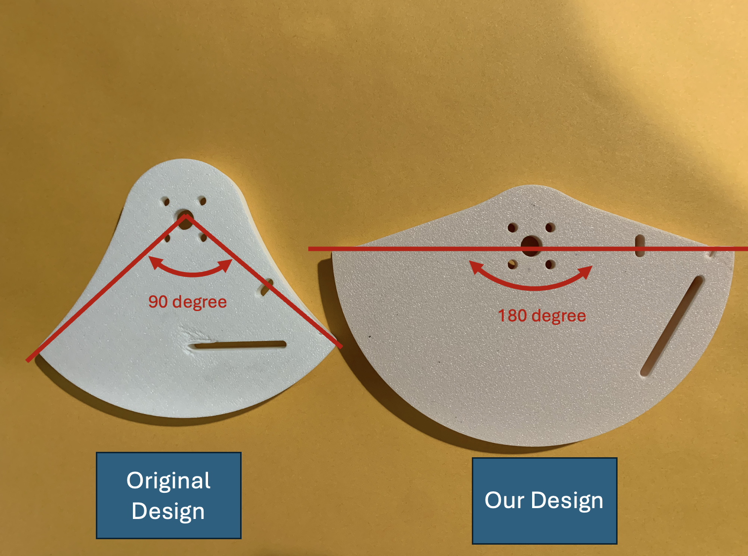 Our design involves in create two 180-degree sector, which consists a larger angle of linkage swing. This results in a larger workspace in y directions, covering all gaming space shown on the screen. Our final sector design included 10 degree increments for easier calibration.