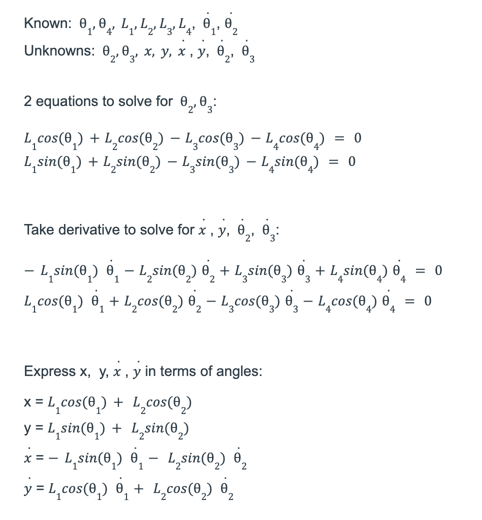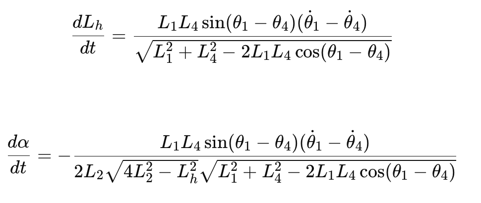 To further analyze the dynamics of our haptic interface, we need to determine the derivatives of the handle coordinates xh and yh. These derivatives are essential for understanding the velocity of the handle in the workspace and will be necessary to calculate any damping force we want to add to the handle. Given that θ_dot1 and θ_dot4 are known, we will focus on explicitly expressing θ_dot2.
