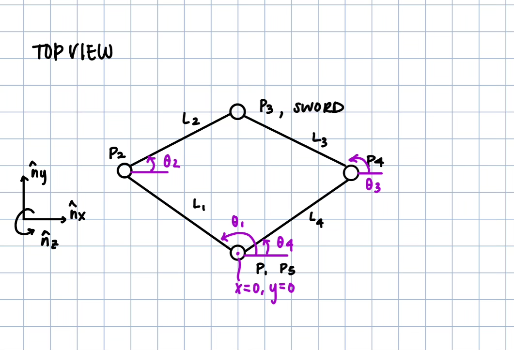 For our haptic interface, we utilized a 4-bar linkage, commonly referred to as a pantograph. This pantograph design allows for a 2-degree of freedom workspace. The initial step in analyzing this system was determining how to obtain the x,y coordinates of the handle on the pantograph. Below is a diagram of our pantograph, highlighting the relevant unknown angles and constant lengths.