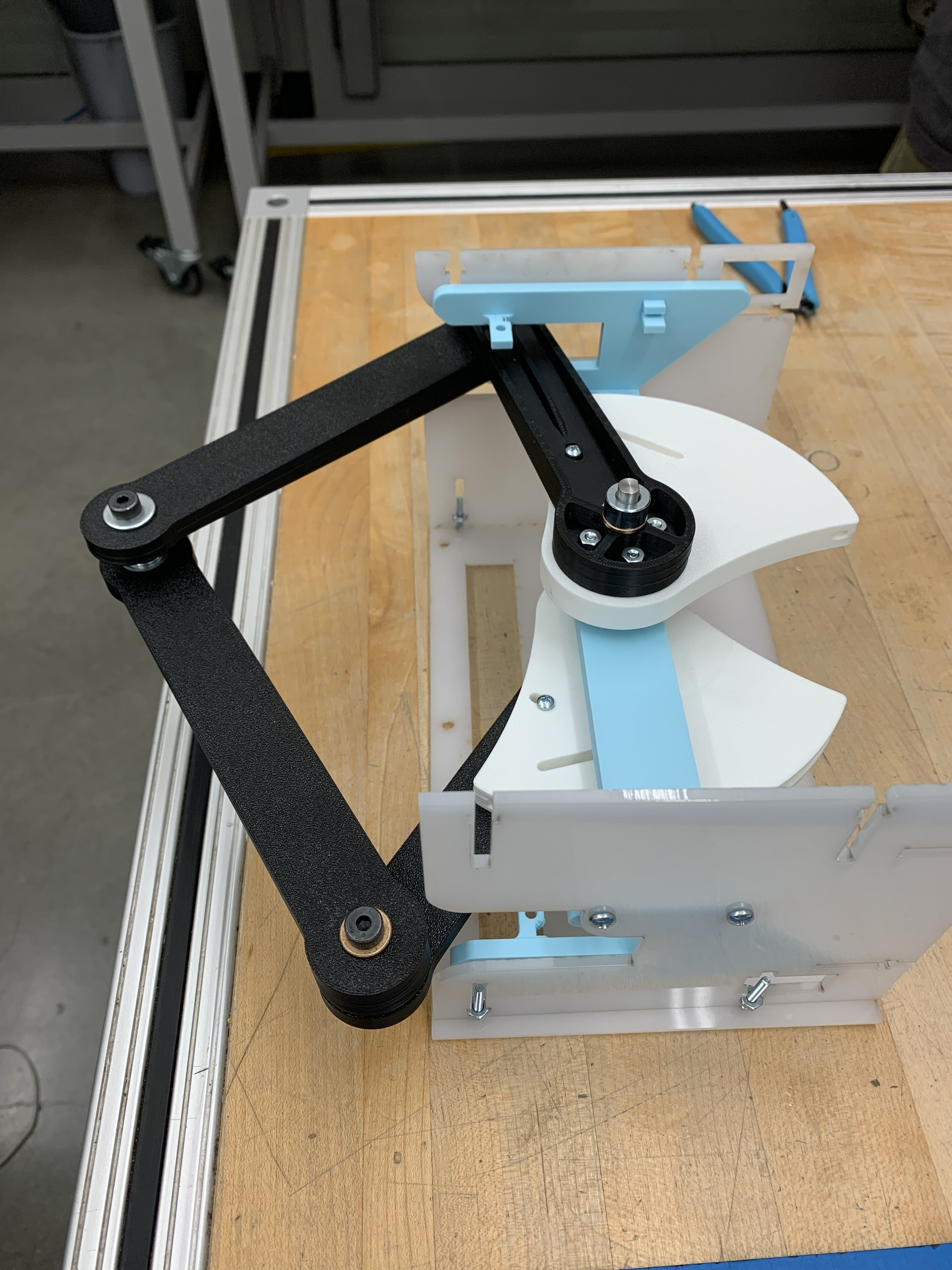 (2) Mechanical Design This week, our group tested the modified GraphKit linkage based on a previous ME327 project (V1) and thought of further improvements to the system to increase the GraphKit’s workspace and ease of assembly. We will be modeling and prototyping these improvements in the coming days to test with We successfully 3D printed the V1 linkages and the sectors this week and conducted initial testing with the pantograph. Our joint connections are currently implemented with shoulder screws, bushings, and washers. We are currently debating if we will use ball bearings going forward or if the gains would be minimal compared to our current bushing setup.