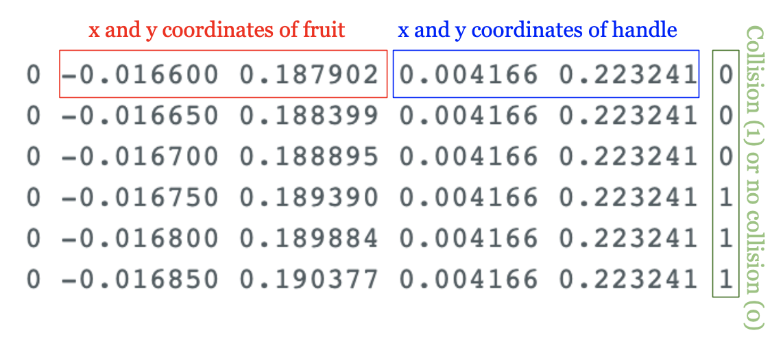 Below is a screenshot of the Serial print. The first set of coordinates circled in red represents the coordinates of the watermelon. The next set corresponds to the coordinates of the handle, and the final value indicates whether there is a collision (1) or not (0). Collision detection is performed by checking if the handle coordinates are within a certain radius of the watermelon coordinates. While the kinematics for the position of the handle have been developed, the angles have been set to constant values. This is because we currently cannot use the pantograph to vary the two known angles, which are then used to solve for the handle coordinates.