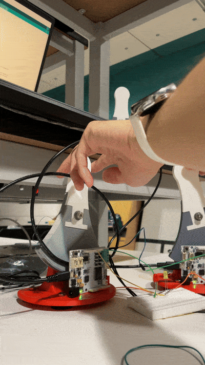 While our pantograph system survived demo day, the top handle of our end effector broke off due to repeated torquing throughout the gaming sessions. To improve physical durability, we’d like to develop a more robust threaded attachment for both end effector halves instead of the current press fit method. Another design change that would reduce movement friction and reduce damaging torques would be to add a rolling ball point bottom end effector that would provide smooth motion and extra support for the currently cantilevered pantograph system.