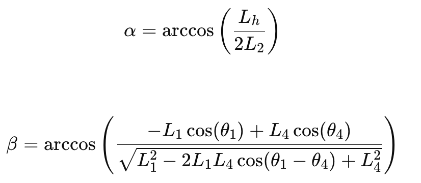 First, we calculate angle α using the law of cosines. Lh is the length between P2 and P4, which divides our system into two isosceles triangles. From the law of cosines, we get: