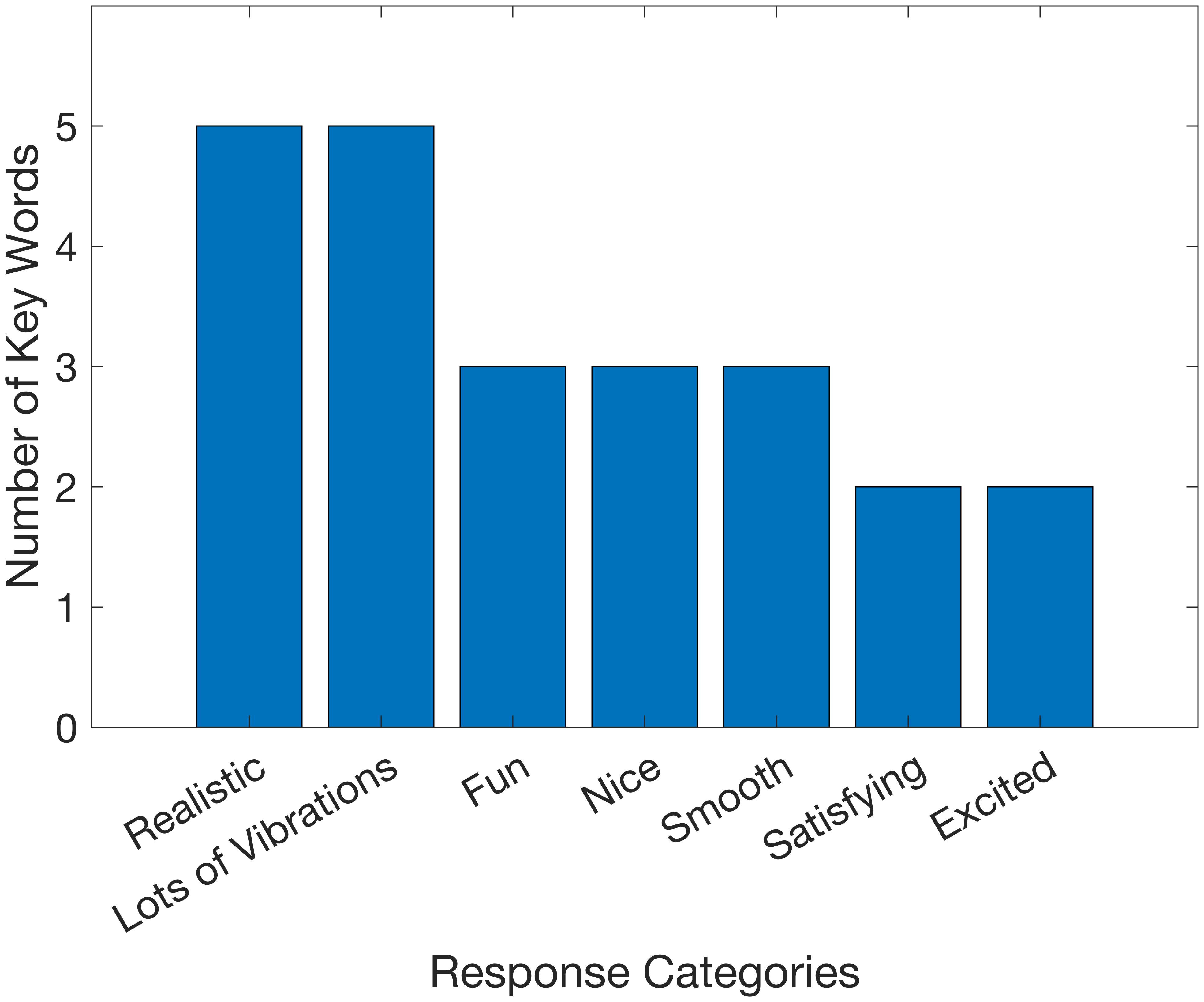 A total of 22 responses are collected in this study. "Realistic" and "vibrations" are the words that appear the most in the "How do you felt when you cut the fruit" answer sections. "Fun," "nice," and "smooth" are the second frequent words appear in this section. The user responses showcases that the force feedbacks during the game play are obvious and realistic. Other comments mentioned that the force feedback from hitting the bombs is much greater than hitting the fruits, which is expected.