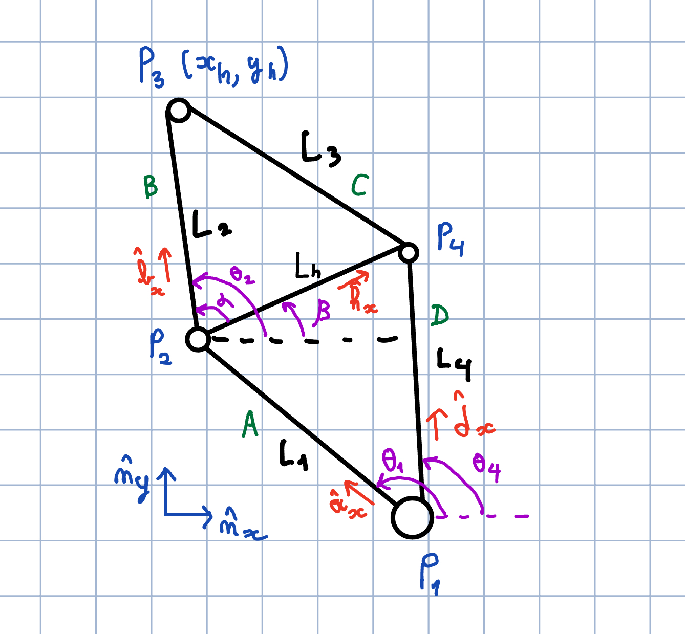 θ1 and θ4 are known since they are determined by the rotation of the motors, which in turn rotate the two bottom arms of the pantograph. The lengths of the pantograph arms are also known; however, θ2 is unknown. θ2 represents the angle between the horizontal and arm B. To find the x and y positions of P3 (denoted as xh and yh), we first need to calculate the vector from P1 to P3, then take the dot product with the horizontal and vertical unit vectors nx⃗ and ny⃗.