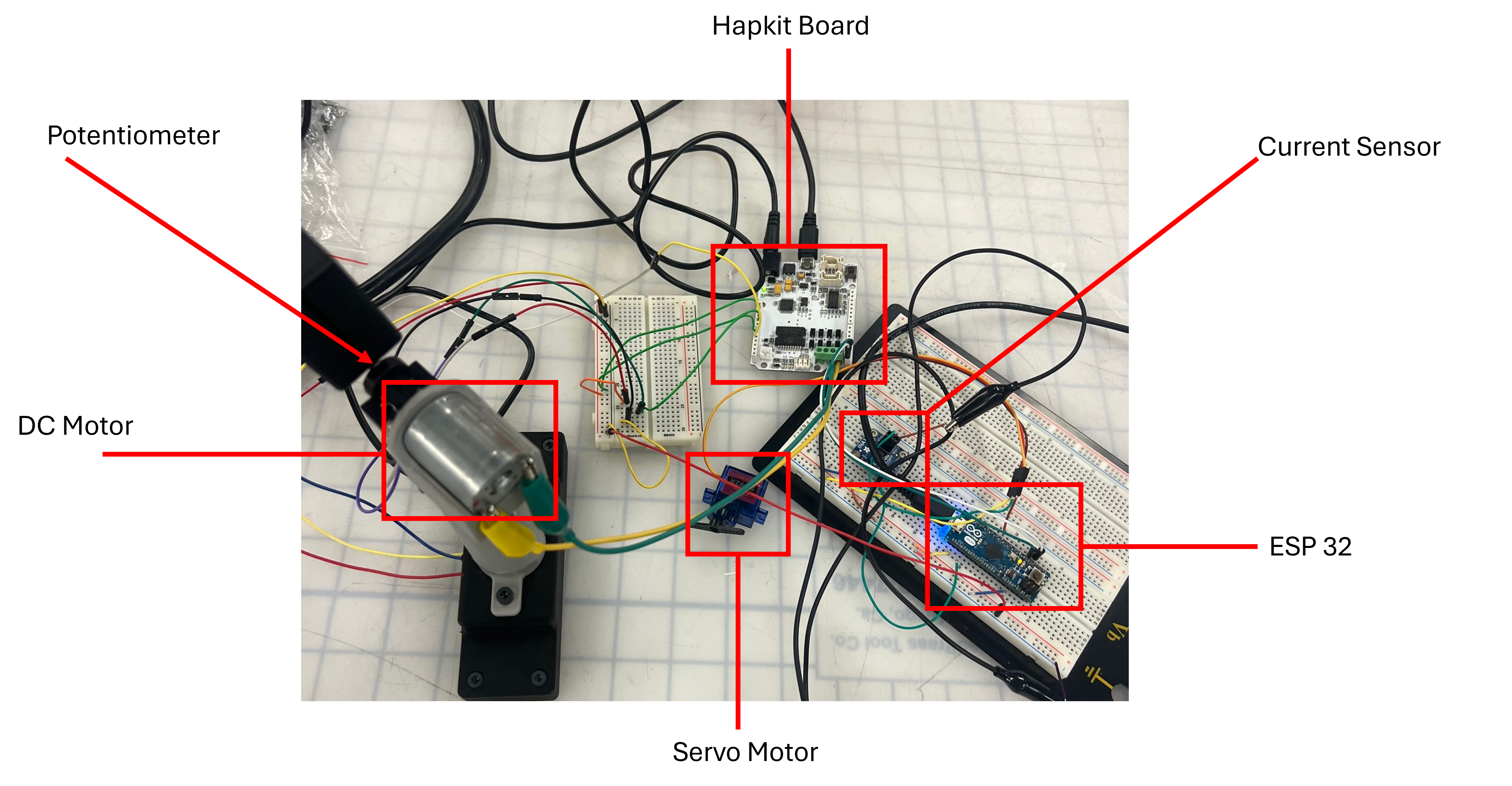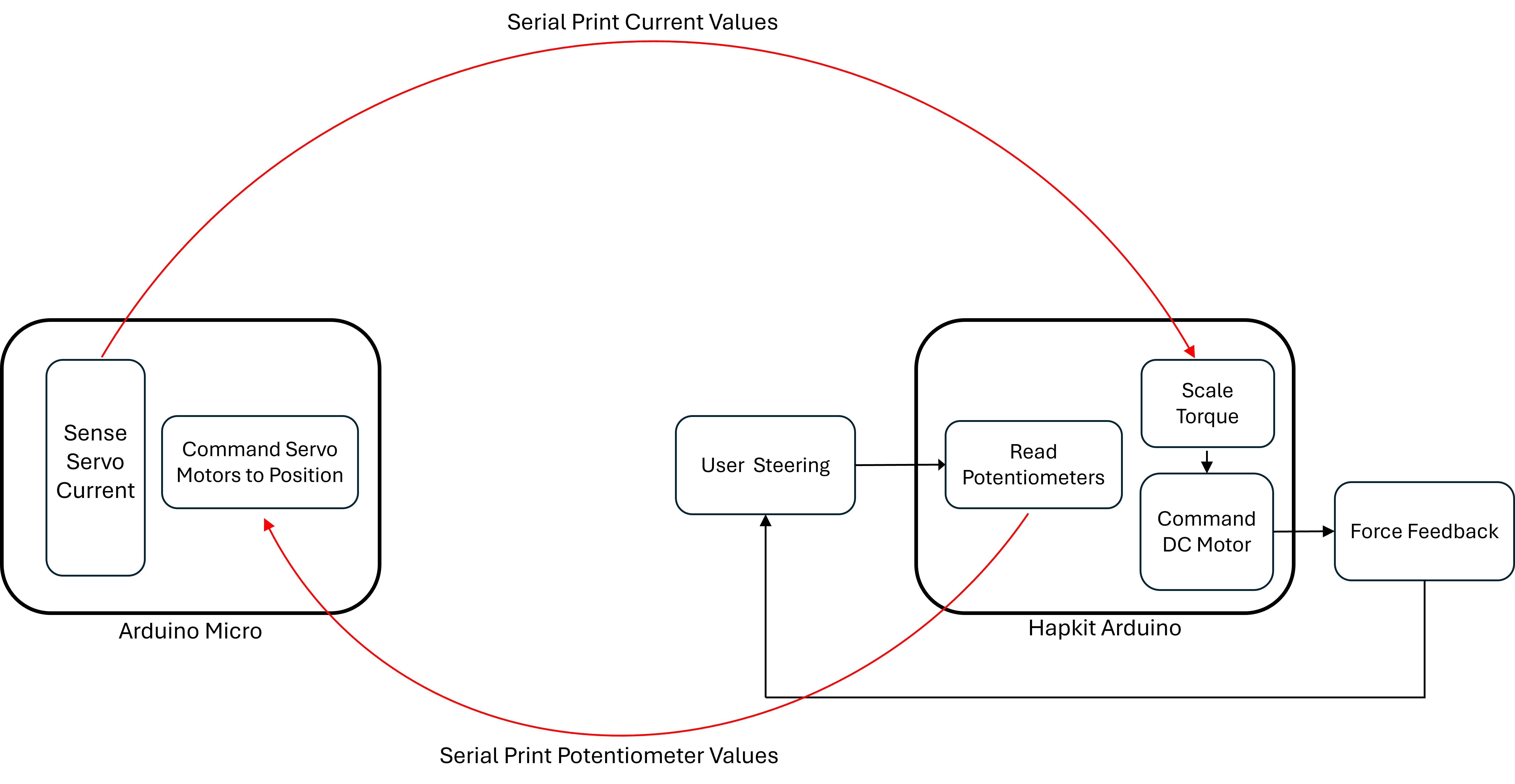 2) ESP32 reads in servo motor current values from the current sensor, sends to Arduino and commands DC motor to produce torque as force feedback