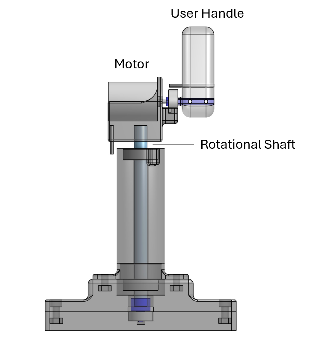 We implemented this design change in CAD, 3D-printed, and assembled our fixture (Figure 2, 3), however the 3D-printed motor shaft adapter connecting the motor to the user handle failed due to shearing. We tried reinforcing the 3D printed part with a small metal shaft, however since the part is very thin, we still experienced failure. For our next checkpoint we will remanufacture this component to improve its strength either by changing the 3D print direction or changing the material to metal or a composite.