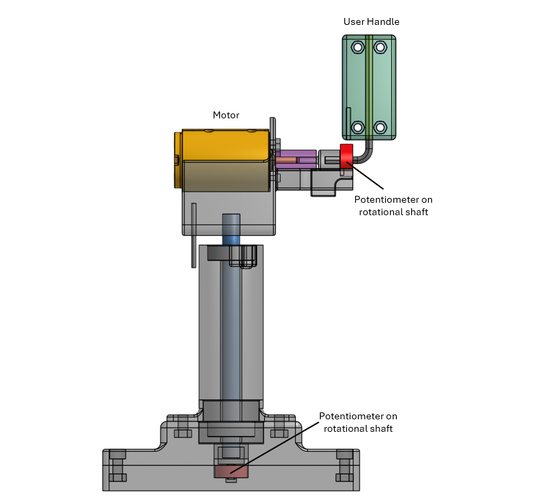 From our initial proposal we have made one major important change to the design of the teleoperation fixture: From anecdotes of operating the vine robot, motor 2 in Figure 1 is often the motor that is at high risk of experiencing excess current (Figure 1). Since motor 1 has low risk of experiencing overcurrent, we decided that it would not be necessary to incorporate force feedback for this motor’s 1 DOF. Our user handle will still teleoperate this degree of freedom on the vine robot, but without force feedback. This DOF will be incorporated into our fixture with a rotational shaft on a bearing and a potentiometer to send position commands to the corresponding servo motor on the vine robot.