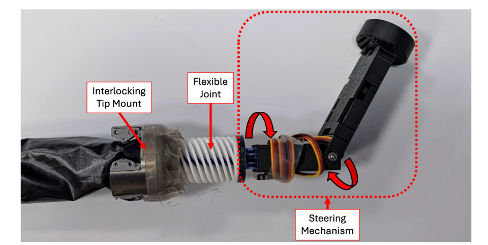 The haptic feedback interface consists of a teleoperation fixture with one powered degree of freedom and one unpowered degree of freedom. The two degrees of freedom are the same as the robot tip for intuitive steering. The user handle is similar to the extrusion on the tip of the robot that holds the camera. To operate the vine robot, the user manipulates the orientation of the user handle which teleoperates the tip of the robot. Force feedback is provided through current sensing on the distal servo motor. The direction of the force feedback indicates to the user which direction to steer in order to reduce current in the distal servo motor. When the steering mechanism encounters a physical wall, the force feedback to the user will simulate a virtual wall with high stiffness.