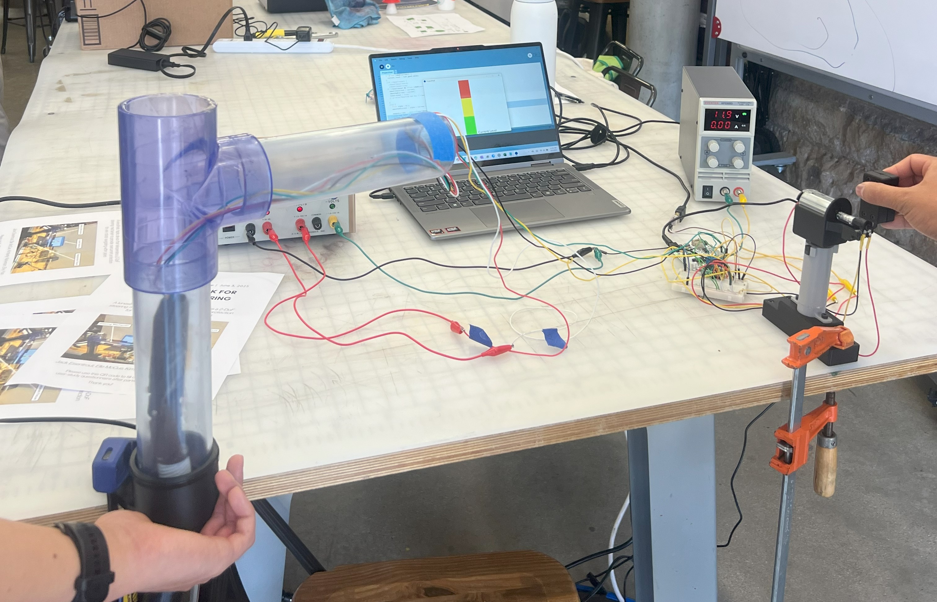 With our fixture built and our mechatronics components functioning and communicating the next step for us is to finetune the force feedback output at the user handle. Currently, with the Hapkit DC motor we are able to perceive the force feedback when steering the servo motors, however, our feeling was that the feedback is not strong enough to discourage a user from continuing to steer in a way that will overcurrent the motors. To remedy this, we have discussed adjusting the handle form factor to maximize the force feedback, acquiring a more powerful direct drive motor, and adding a transmission by adapting our Hapkit capstan.