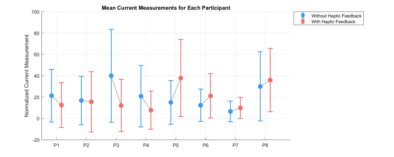 Comparison of motor current levels with and without haptic feedback