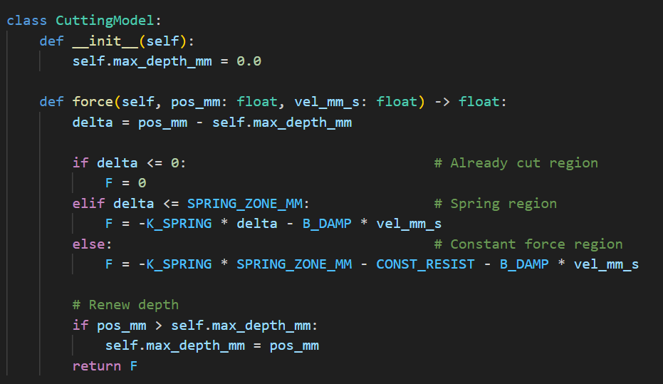 This code is currently used to calculate the force feedback from the handle. It is divided into three situations, when the blade is in the current maximum cutting position; The blade exceeds the maximum cutting position, but it is in the elastic region; The cutting edge exceeds the maximum elastic region. These three situations will make the handle provide: 0n; Spring-like force; Fixed force. At the same time, the latter two will also have a damping.