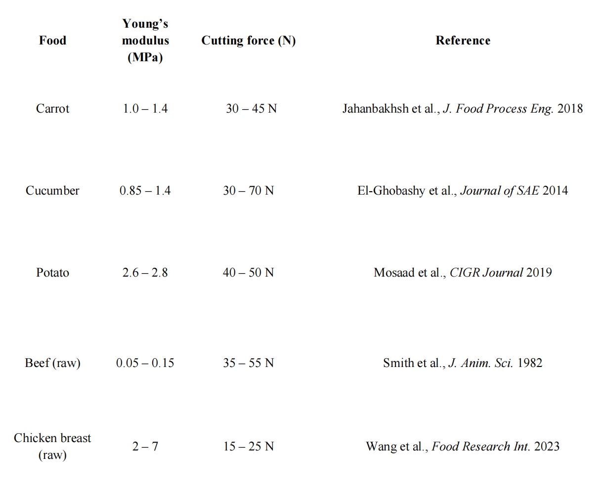 1. Material modeling: Obtain the Young’s modulus and cutting-force data for five ingredients(carrot, cucumber, potato, raw beef, raw chicken breast), here is the table.