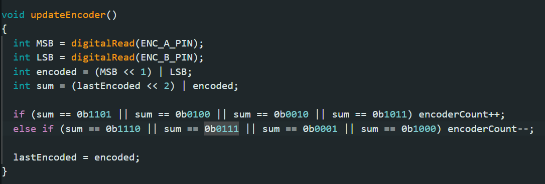 The encoder is wired to pins D2 and D3, each configured as INPUT_PULLUP and attached to the same ISR updateEncoder(), which fires on every level change. Inside the ISR, the current A/B levels are packed into a two-bit value encoded, merged with the previous state lastEncoded to form a four-bit Gray-code sequence sum; if sum matches one of the four forward patterns (1101 / 0100 / 0010 / 1011) it increments encoderCount, and if it matches one of the four reverse patterns (1110 / 0111 / 0001 / 1000) it decrements the counter, then stores lastEncoded = encoded for next time. In the main loop, interrupts are briefly disabled to copy encoderCount atomically; that count is multiplied by the constant RAD_PER_PULSE (radians per pulse) to obtain the current angle theta = -(count × RAD_PER_PULSE), and differenced over the elapsed microseconds to yield angular velocity omega. Thus every encoder edge is converted—without loss—into real-time angle and speed values for the torque-generation model.