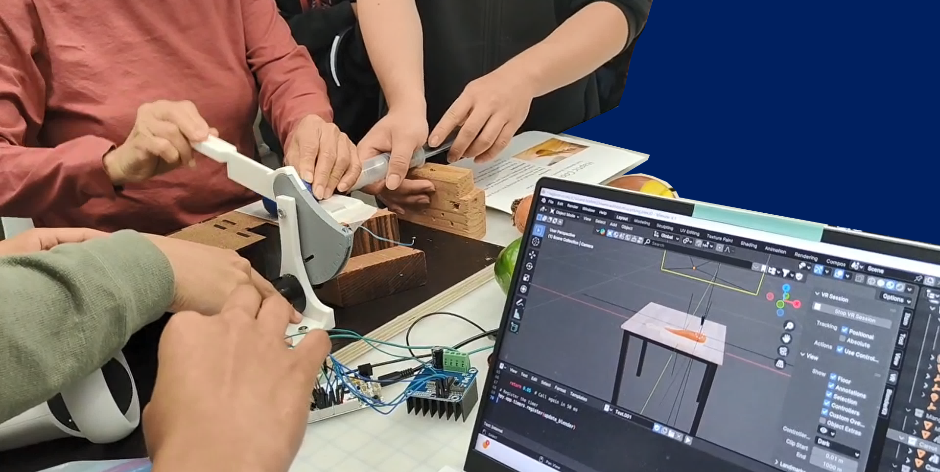 During the open house demonstration, users were invited to interact with our haptic cutting system, which simulated the tactile experience of slicing three different ingredients: mango, carrot, and green pepper. Each user wore a VR headset to align the virtual environment with the physical setup, held the cutting handle with their right hand, and grasped a balloon embedded with particle jamming material in the other hand.