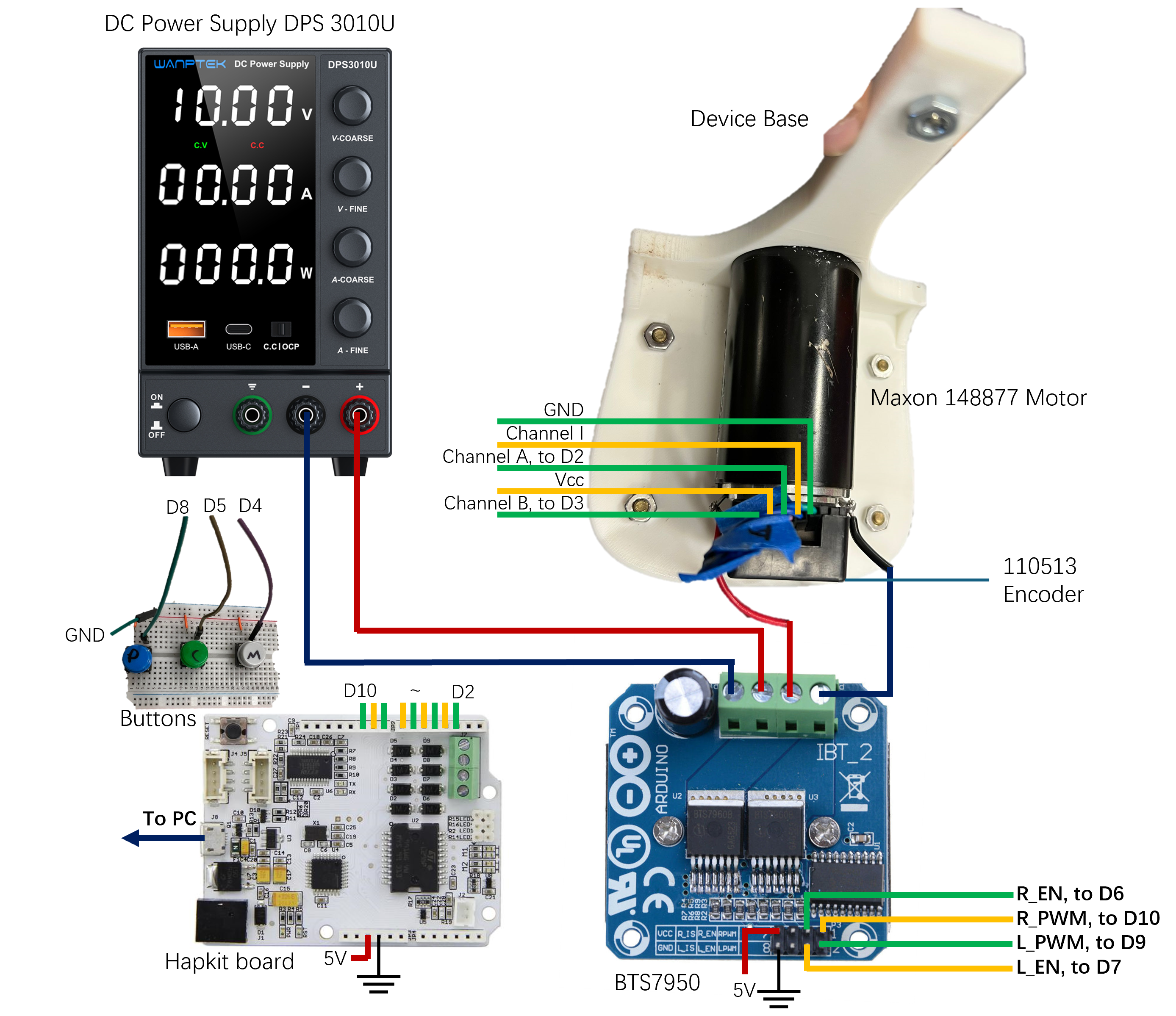 The haptic cutting device consists of several major components: a brush DC motor (Maxon 148877), an encoder (110513) (combined as part number 199554), a Hapkit control board (based on Arduino UNO), a custom stand, a custom knife handle, capstan drive cable with helical bolt, a BTS7960 motor driver, and a DC regulated power supply. The system can be divided into two main subsystems: mechanical and electrical.