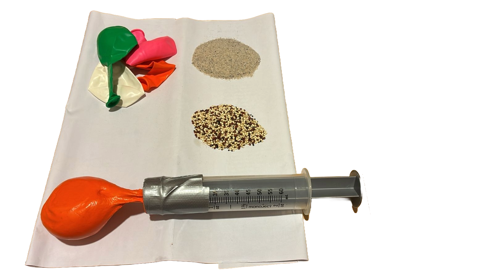 Our device also utilizes particle jamming to replicate the tactile experience of holding various vegetables/fruits. The setup involves a syringe with a 0-60 ml capacity for controlling particle jamming, paired with balloons(large syringe with mouth glued to the opening of the balloon to make it airtight. ) filled with two types of particles: sand and quinoa. By adjusting the amount of air and the amount of particles in the balloons, we can simulate the feel of different vegetables/fruits such as tomatoes, onions, avocados, and potatoes. When the air was pumped into the balloon, the stiffness of the balloon with sand decreases, resulting in a soft and springy experience. Otherwise the stiffness can be increased while we create the vacuum in the balloon, creating a rock-like experience.