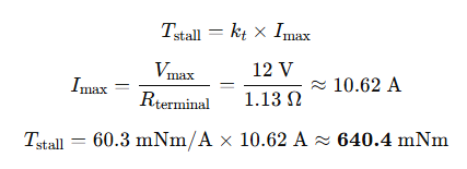 In theory, the motor's maximum torque is limited by its stall current and torque constant: