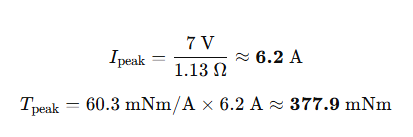 In practice, we observed a peak current of about **0.5 A** on the power supply display, suggesting an average torque output of: