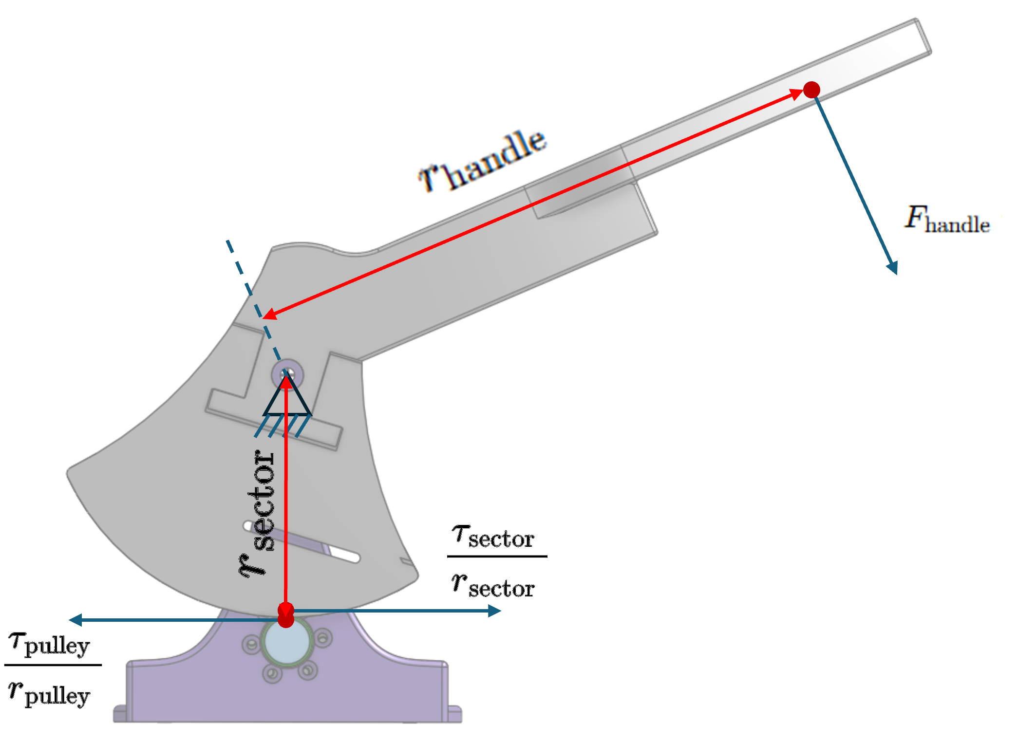As shown in the diagram below, assuming the motor applies a constant torque tau_pulley to the pulley and the user applies a force F_handle perpendicular to the handle, the relationship is: