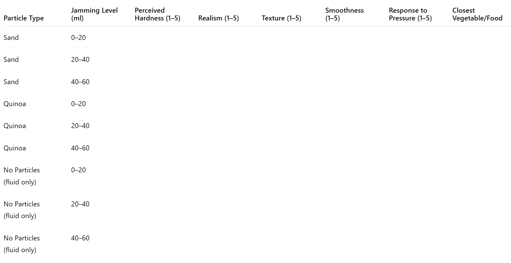 This experiment utilizes particle jamming to replicate the tactile experience of holding various vegetables. The setup involves a syringe with a 0-60 ml capacity for controlling particle jamming, paired with balloons filled with two types of particles: sand and quinoa. By adjusting the amount of air and the amount of particles in the balloons, we can simulate the feel of different vegetables such as tomatoes, onions, avocados, and potatoes. The goal is to investigate how particle jamming can mimic the softness, texture, and stiffness of these vegetables, providing insights into how materials can be manipulated for haptic feedback.