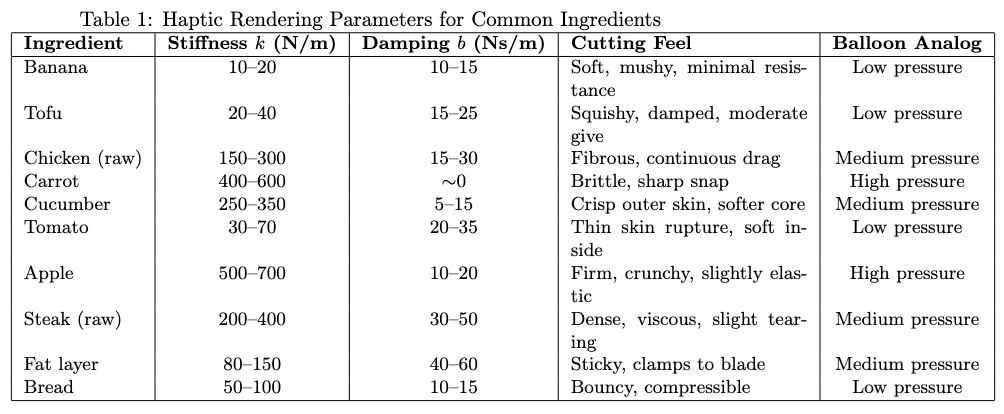 Finally, in “Leveraging Multimodal Haptic Sensory Data for Robust Cutting”, researchers from Carnegie Mellon collected force and vibration data from a robot slicing 25 food types to train neural networks for material classification. While their focus is on robotic perception and not haptic rendering, their segmentation of food items into categories (e.g., soft, hard-skin, hard) and characterization of cutting phases (engagement, slicing, exit) are informative. These observed patterns help define force profiles for various foods, guiding our parameterization of resistance and force transients in the rendering engine, even without a learning component. [3]