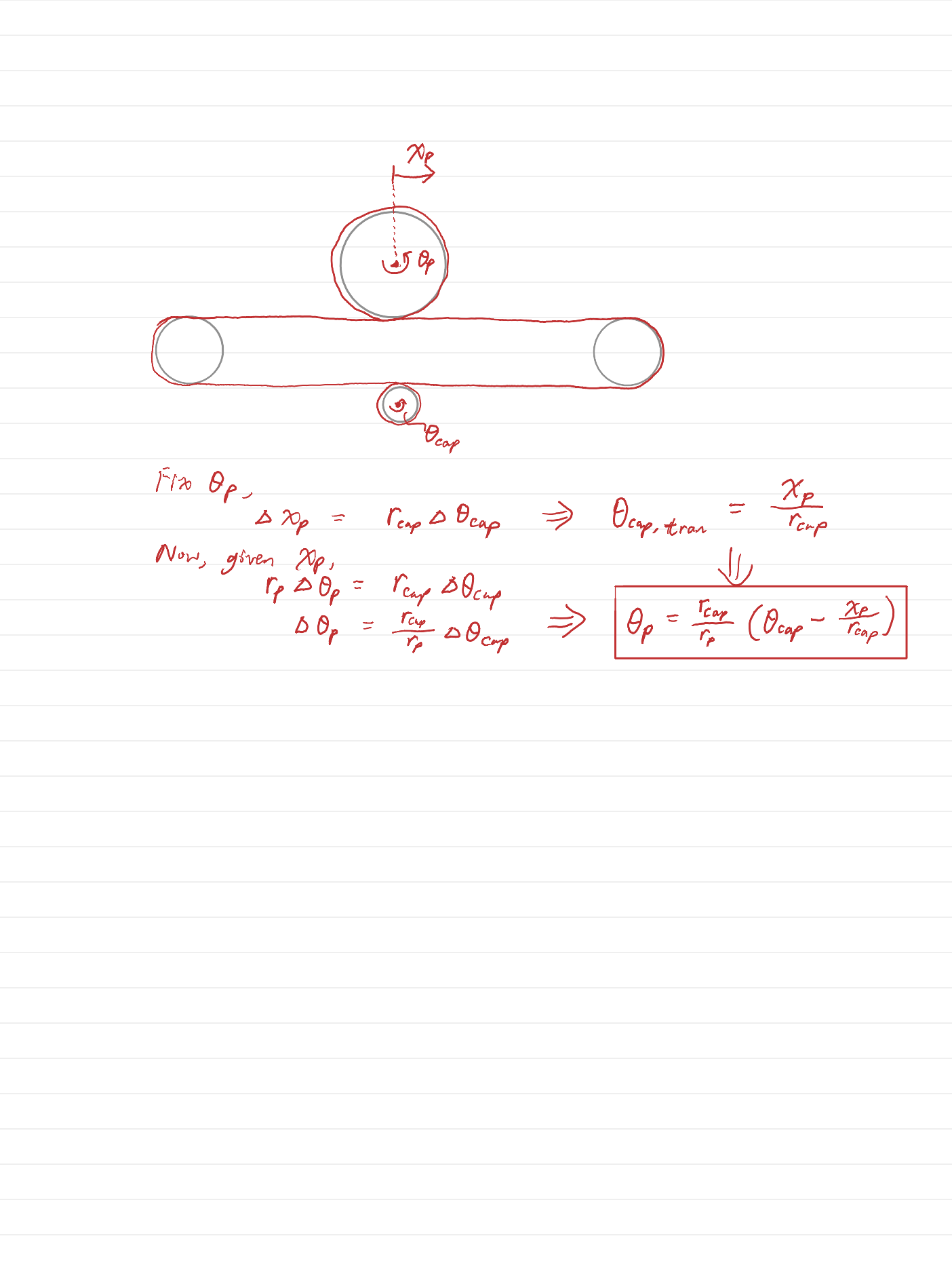 Nevertheless, since xp is obtained from the linkage system and we didn't have extremely precise measurements of all the lengths and radii, the term (xp/R_p) was empirically fitted by a first order linear regression. That means, the actual equation used in our pulley control was