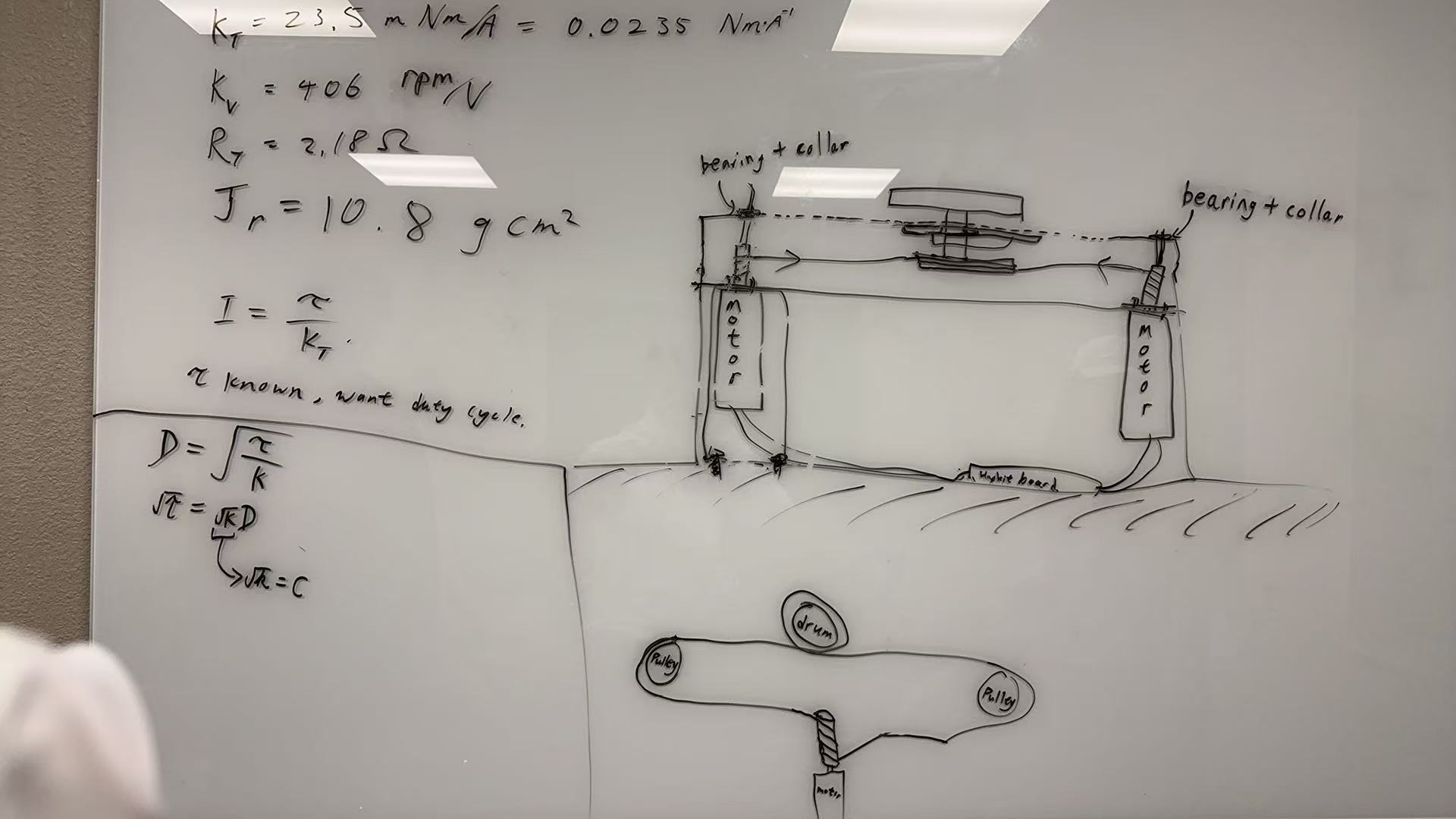 This expressions allow us to estimate the required PWM duty cycle D from a desired torque τ, using a fitted constant K to account for system-specific factors such as resistance and efficiency. To empirically get this coefficient, we did a linear least-squares between square root of the output torque against duty cycle. Data was obtained by hanging weights from the motor and measuring the duty cycle required to balance this weight as shown below.