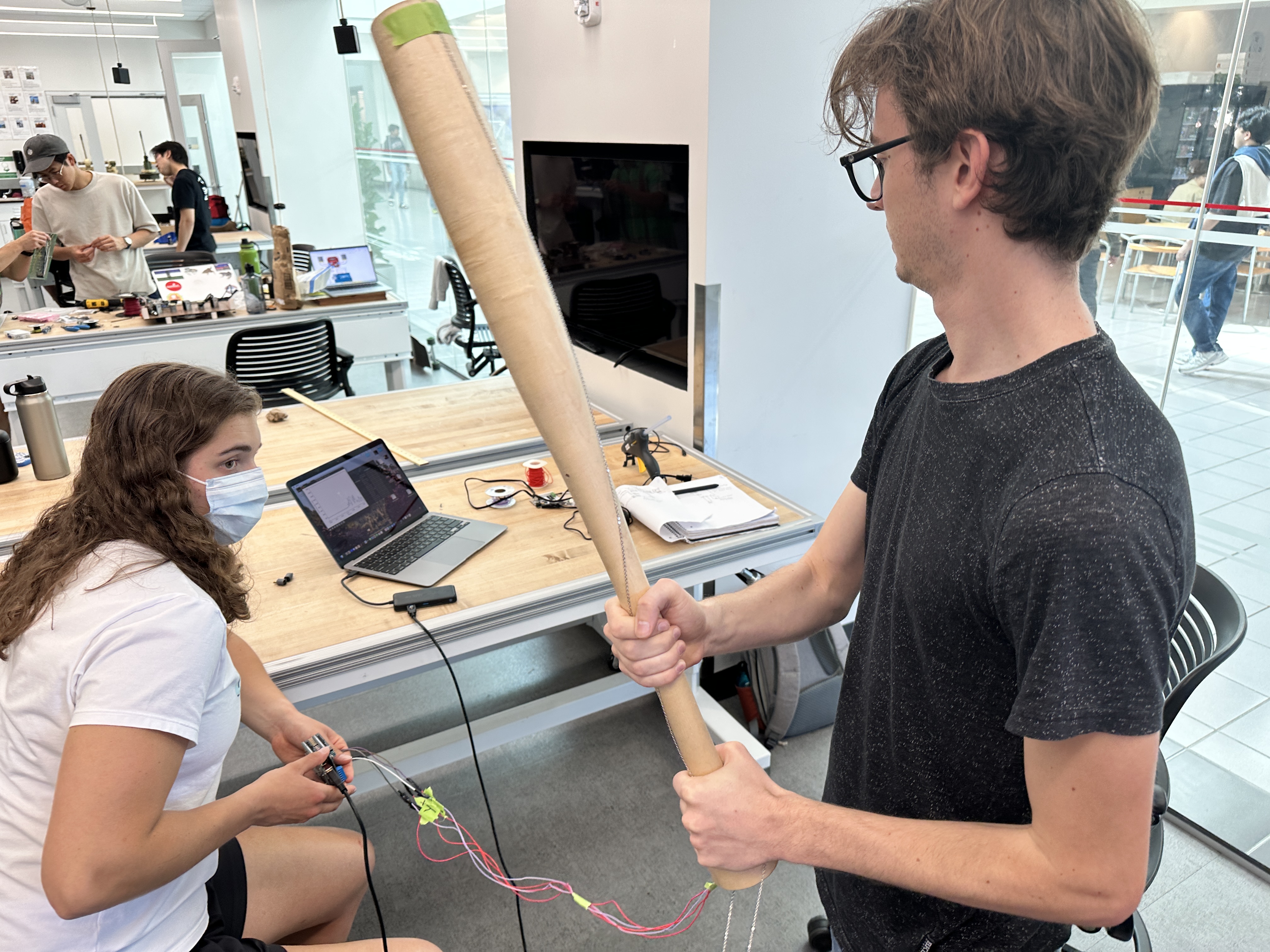 This wiring process had to be redone as we realized we needed to core out wider diameter holes on either end of the bat. For future makers, double check the sizing of all electronics in advance! However, our workflow was smoother at this point and rewiring was not particularly challenging after coring out the bat ends with Forstner drill bits.