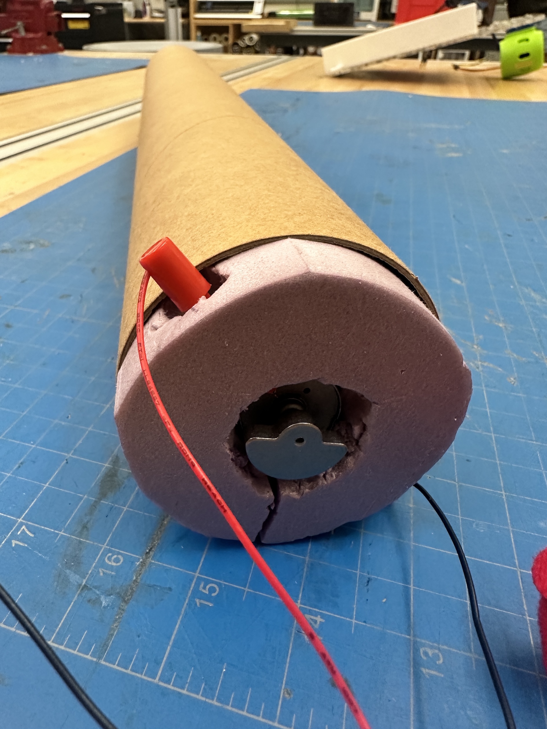 The fabrication of the wooden bat that we will use is ongoing, so we chose to test the motors with a thick, hollow cardboard tube. The motor was mounted into pink foam that was secured to one end of the tube. Once this mounting was complete, we pulsed the motor using a variable power supply while the tester held both the opposite end of the bat (replicating the handle) and the same end of the bat (replicating the barrel). This rudimentary testing leads us to believe that the ERM we purchased is powerful and large enough to generate the desired haptic feedback.