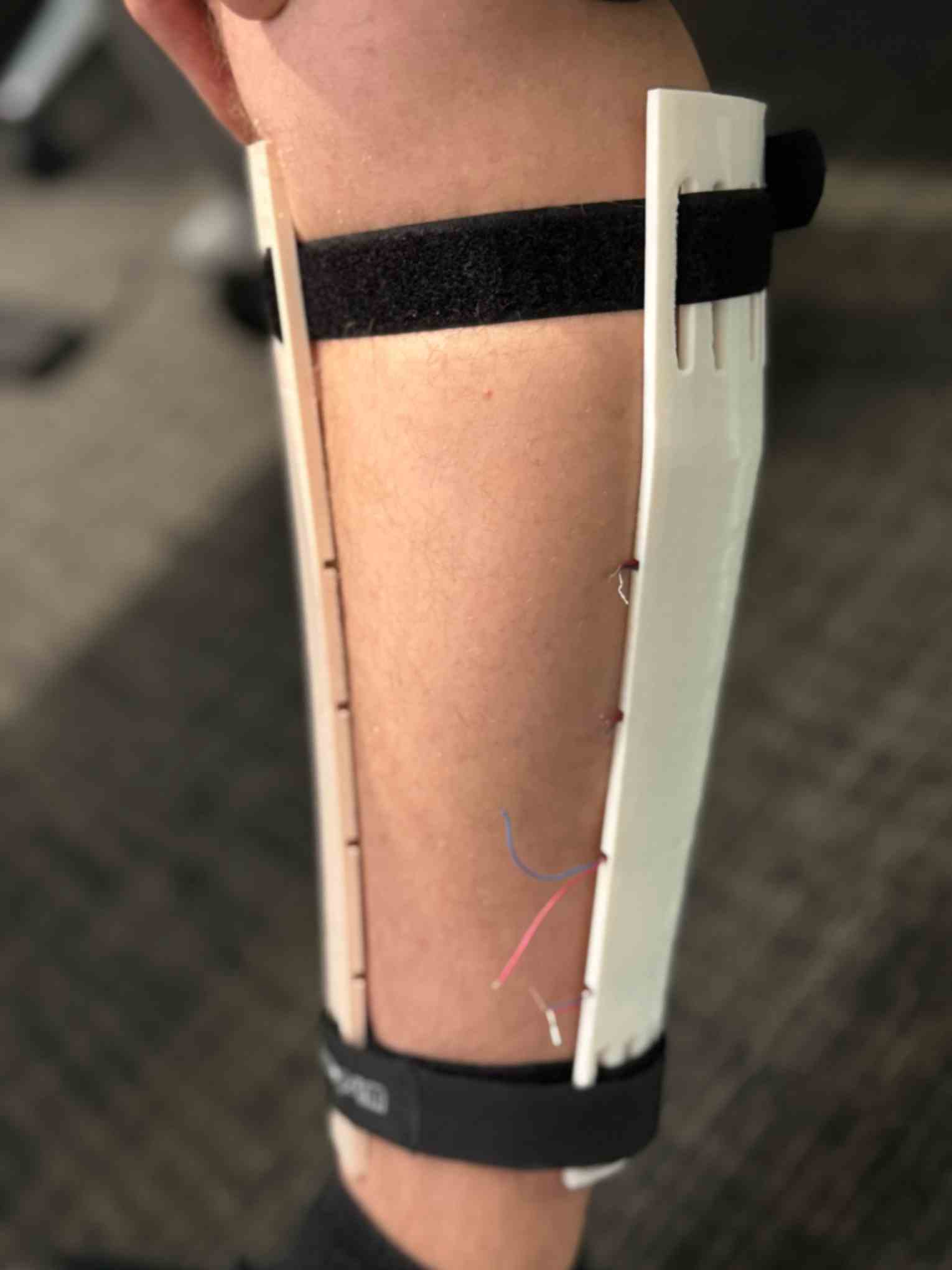 3. Prototyped a rigid, three strut brace that can hold up to 16 coin vibration motors that can be mounted to the calf and shins with velcro straps. We still need to complete the wiring of all the motors (we ordered an additional 15 motors), but once complete, we can experiment with different vibration patterns and intensities to communicate information to the user (saltation effect, pulses, etc).