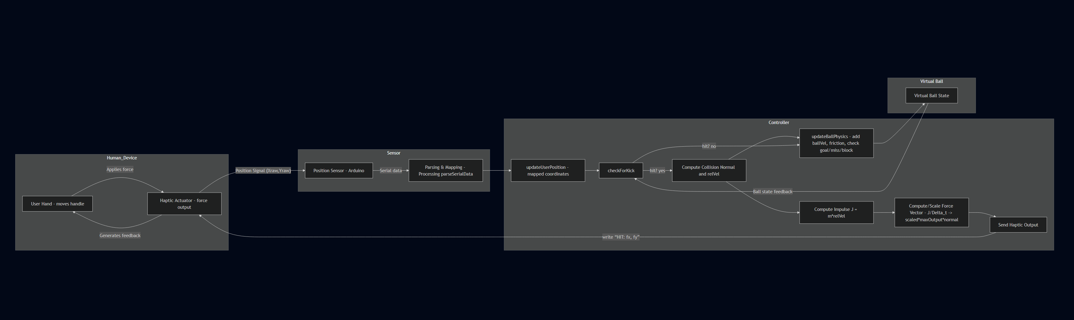 All the kinematics and force calculations were uploaded to the main Hapkit, which output the forces to both motors. The flow between the hapkit's arduino and processing is shown below. Essentially only user position is handled by arduino and output to processing. Processing keeps track of the virtual ball state and has basic collision detecting logic. On collision we get the normal vector between the user and the ball's position. We grab the user's velocity by subtracting the user position from the user's previous position (as this function is called once per frame, we are essentially identifying the velocity in pixels per frame). We then get the relative velocity by projecting the user's velocity onto the unit normal. This velocity is then added to our ball. When creating our force, we calculate the impulse based off of an artificial ball mass in kg that we tune for feeling. We always enforce a minimum impulse such that the ball will always move/be felt despite how slow the user is going. Lastly because we are calculating forces in a "pixel" and "frame" unit, we needed a way to convert this into the Newtons our arduino would be using.