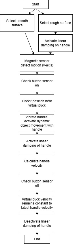 We discussed several rendering algorithms to simulate the most realistic shuffleboard haptic system. To do this, we created the block diagram below. To start, there are two different surfaces we want to render (smooth vs. rough surface). The only difference between the two surfaces is the rough surface will present linear damping of the handle. We also decided to realistically rendering the task of picking up the shuffleboard puck and sliding it along the surface until a final release. This will be rendered using a button, which will activate force feedback, dynamic feedback, vibration feedback, and linear damping. Lastly, once the button is turned off, the puck will be released in the GUI and the velocity of the handle will be translated into the simulation. This rendering plan will be further developed in the following checkpoint and will aid us in realistically simulating shuffleboard.