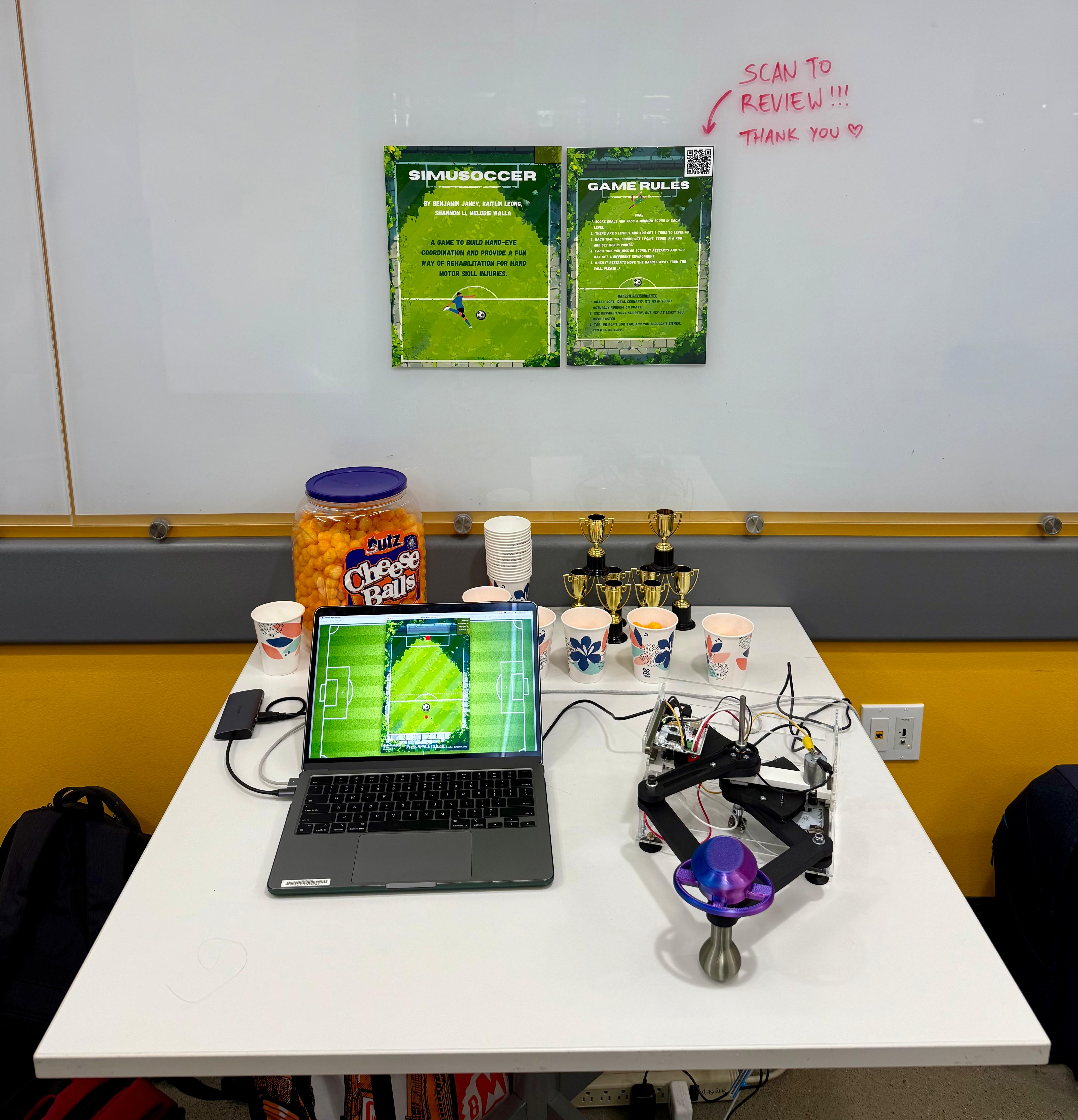 The motivation for our project is grounded in creating an interactive educational tool that merges tactile motor control with visuals. Due to the predominantly virtual nature of our game, the setup is compact and space efficient. Our chosen application, a soccer-inspired game, is well-suited to haptics because it relies heavily on the perception of force and contact. By giving users real-time force feedback when striking and sliding a puck, the device helps reinforce cause-effect relationships between physical input and environmental response. The 2DOF force-feedback design allows for meaningful game play and experimentation that forces users to tune their motor control as they adjust for varying game scenarios. Drawing from prior work on haptic games used for rehabilitation and research into predictive collision rendering, our system serves as both an entertaining and educational device that explores how haptic feedback can enhance user interaction and motor learning.