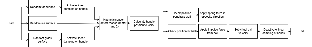 The system has some complexity with three different environments, which mainly adds damping to the handle movement. Regardless of environment, the logic flow of "kicking" the ball in each cycle is quite straightforward. Logic Flow Diagram:
