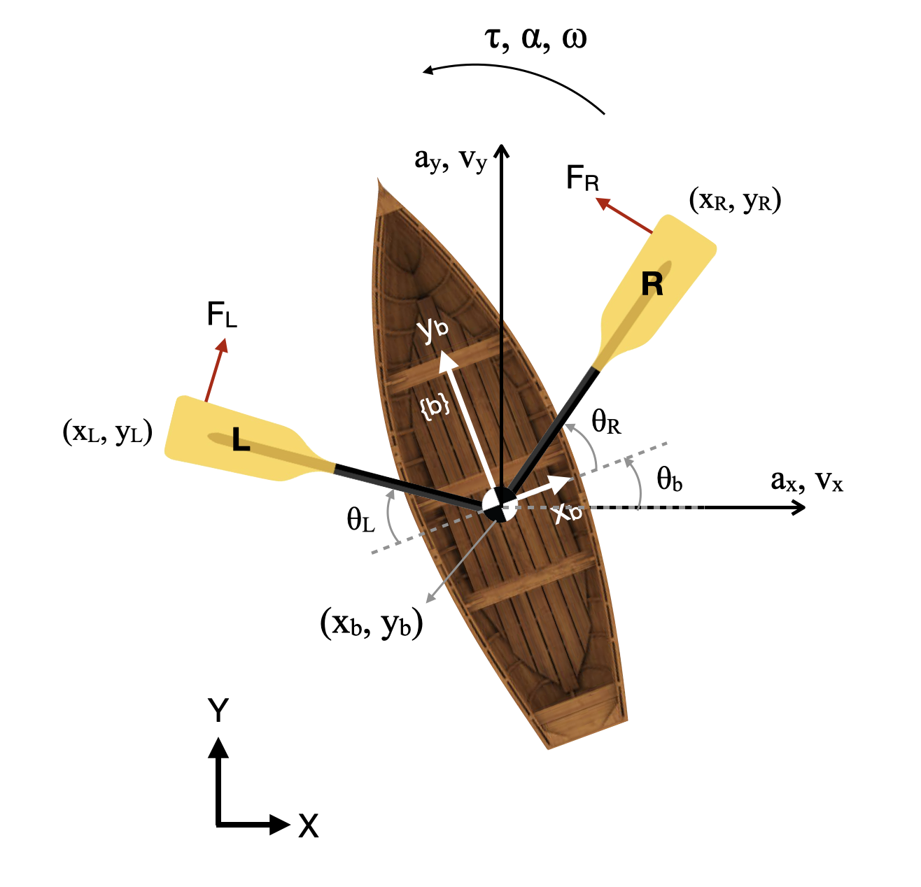 Where l_p is the length of the paddles, b_rotation is the rotational damping of the boat in the water, omega_b is the angular velocity, alpha_b is the angular acceleration, I_b is the inertia of the boat, and theta_b is the angle at which the boat is traveling.