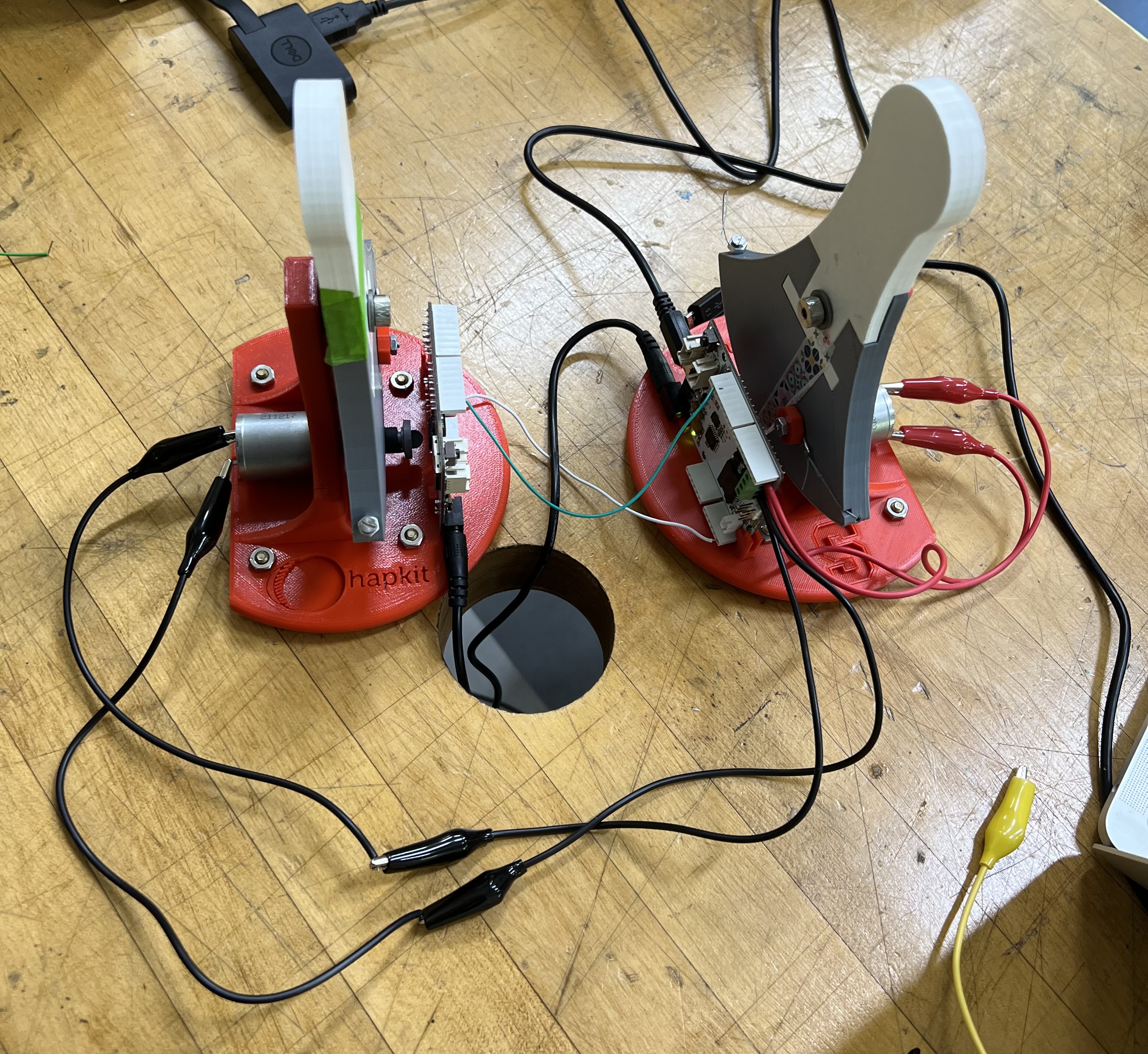 Each hapkit is connected to its own arduino, to maintain the magnetic calibration. The handle position data from the left hapkit is sent to the right, and all calculations are done in the right hapkit code.