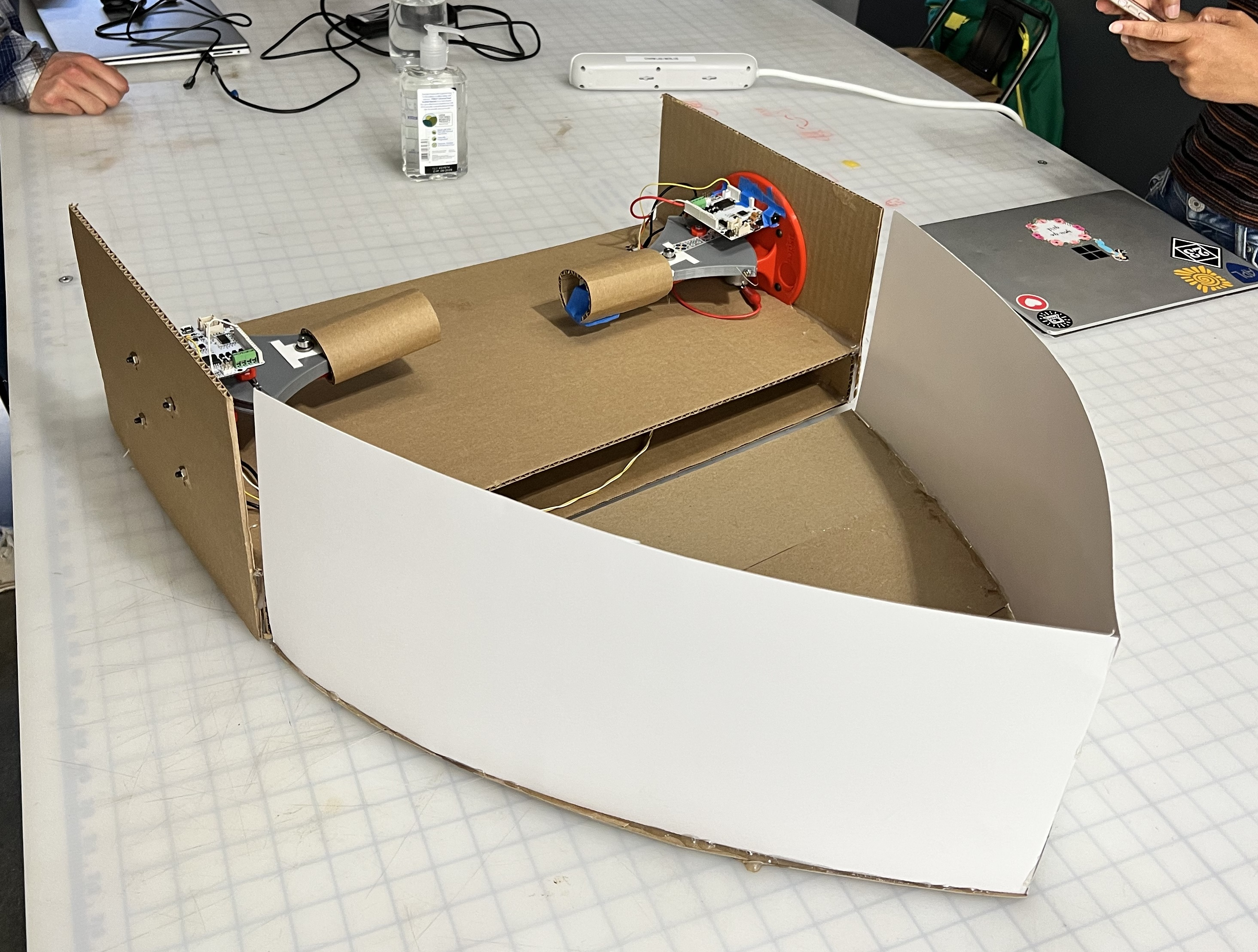 For our visual display, we created a mini-game. There is a straight channel for the boat to travel through, with a finish line at the end. If you pass through the finish line, you win! However, if you hit a wall, the game ends and you lose. After you win or lose, the motors switch off and the hapkit handles rotate freely until the game is reset.
