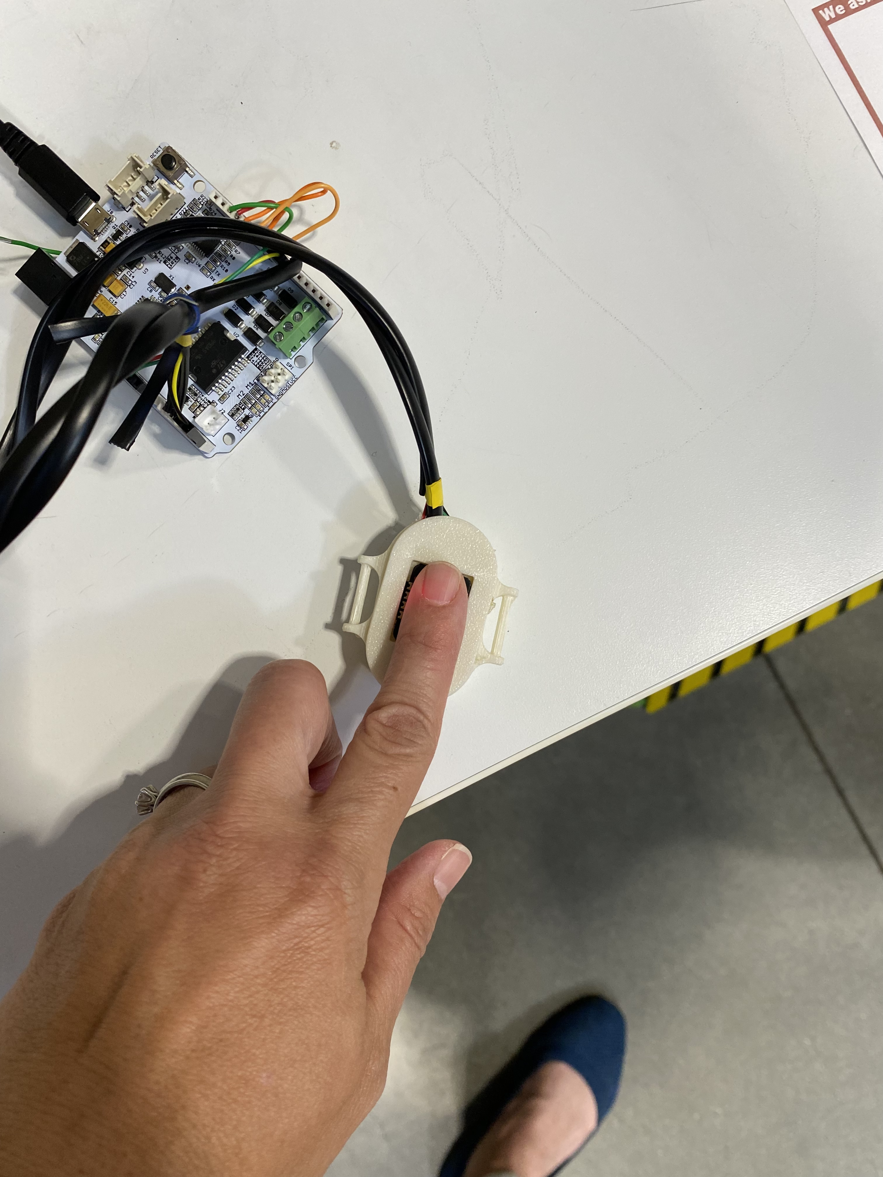 Enclosure. We designed and 3D printed an enclosure to house the MAX30102 sensor and two vibration motors (CAD in Figure A4, Test fit in Figure A5). This was done to make the device more aesthetically pleasing, and also easier to use (holding the vibration motors and sensors individually was tricky). The vibration motors snap into the inside of the base of the enclosure, and the MAX30102 sensor snaps into the "lid" of the enclosure. Then the lid snaps onto the base. One challenge we ran into with this effort was balancing robustness with flexibility on the snap-together parts - they needed to be strong enough not to snap, but flexible enough to bend during the fitting process. Thus, it took us a few iterations until we were satisfied with this part of the project.
