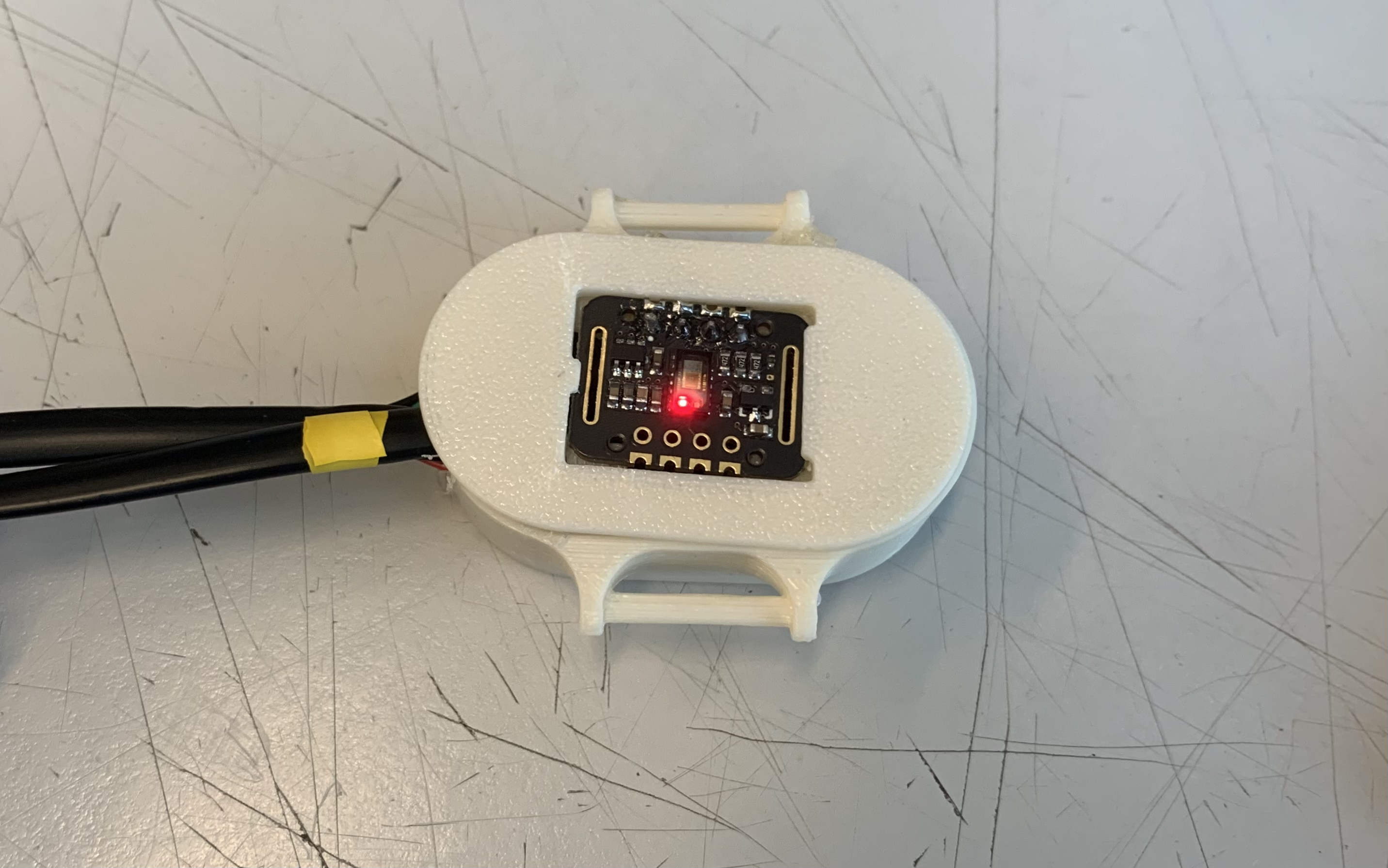 Figure A4. An early version of the enclosure. 3D printed components are blue, vibration motors are red, and the MAX30102 chip is green.