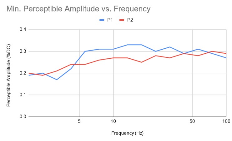 Two of the devices' designers completed this experiment. The experiment involved testing the perceptibility of 16 different frequencies ranging from 1 to 100 Hz (frequencies ramped up logarithmically). The vibration motors were being commanded in a square-wave fashion at 50% duty cycle. At each frequency, the experimenter slowly ramped the vibration motor command amplitude up by 2% steps until the participant reported being able to feel the vibrations. Participants both listened to loud music during the experiment to prevent them from subconsciously perceiving the vibration motor sounds instead of vibrations. P1 used a cloth above and below their hand to dampen the vibrations; P2 did not use cloth.