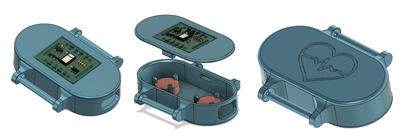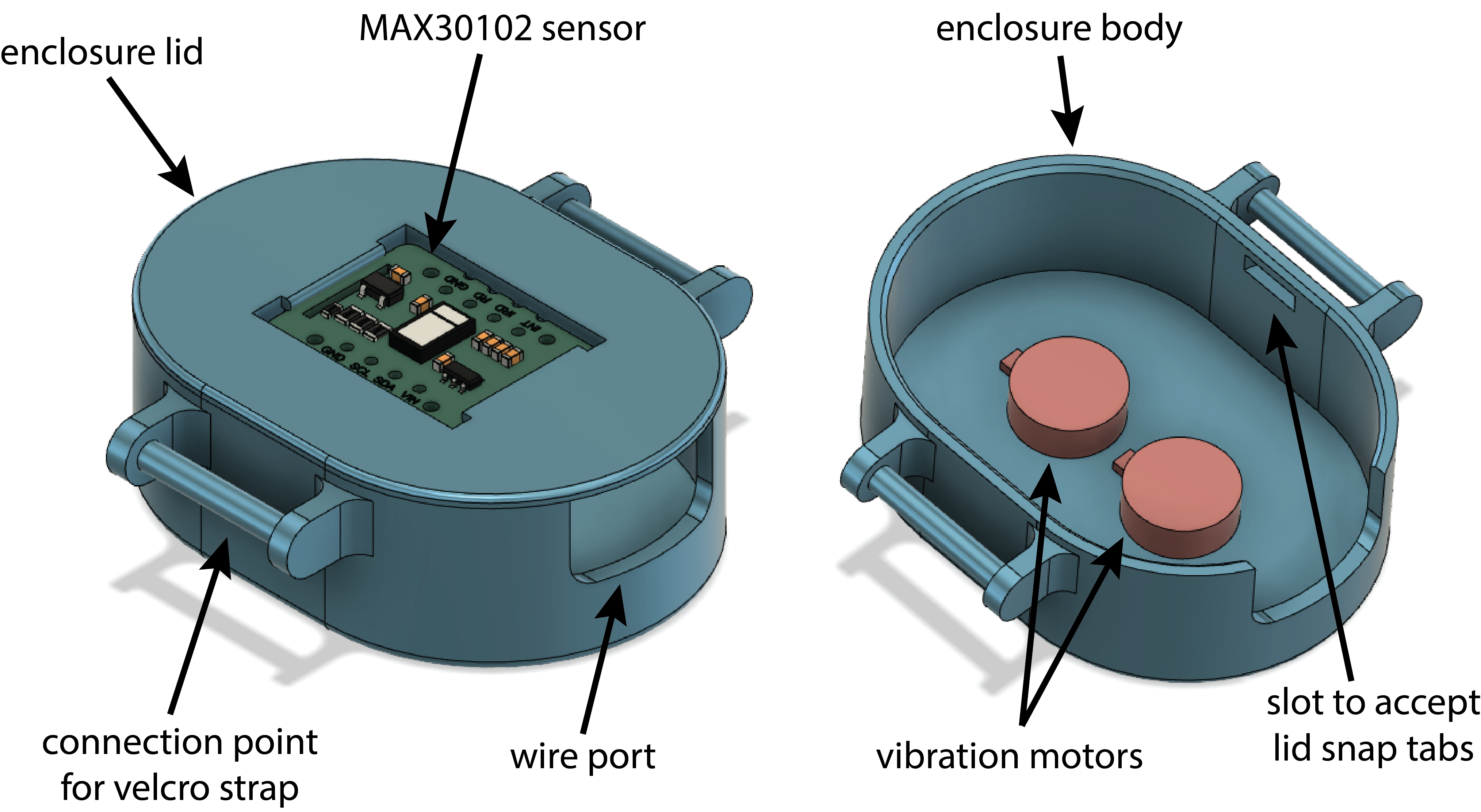The enclosure CAD model is shown below in Figure 1, and the printed version is shown in Figure A5. It was designed in Fusion 360 and 3D printed. The device can be held in the users hand, or can be strapped to a user's wrist or arm using the velcro strapping points. The MAX30102 sensor snaps into the lid, and the lid snaps into the enclosure body. The motors are glued into the base of the body. .