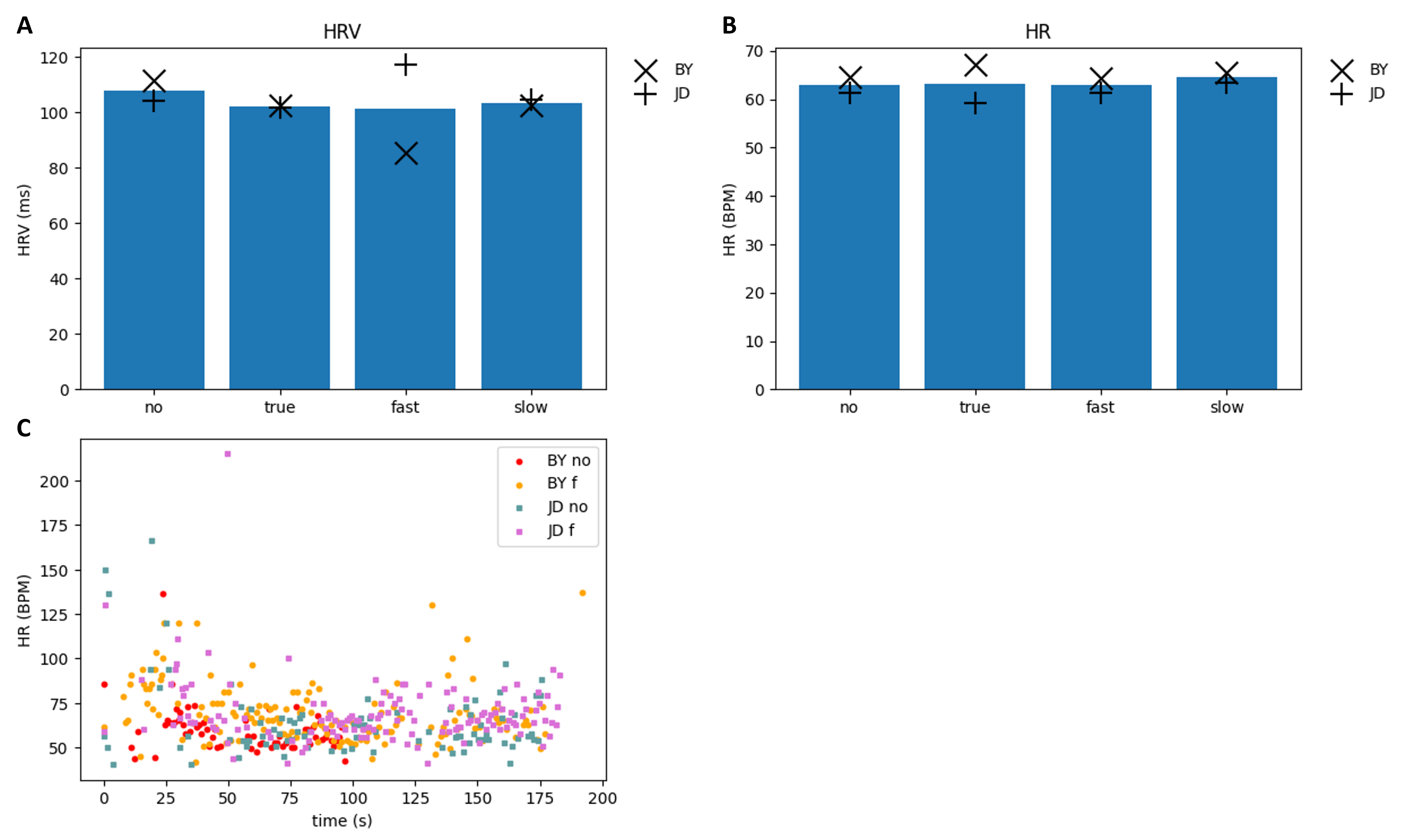 Results are shown in Figure 3, panels A and B. For participant BY, it seemed that the true and slowed HR feedback was moderately stressful (reflected by decrease in HRV) relative to no feedback, and fast HR feedback was quite stressful. Participant JD had a different reaction to feedback - they had minimal changes in HRV in the true HR and slow HR feedback, and surprisingly, their HRV indicated they were more relaxed during the fast HR trial. These findings indicate that more work (especially a larger sample size) is needed to condidently determine the effect of this device.