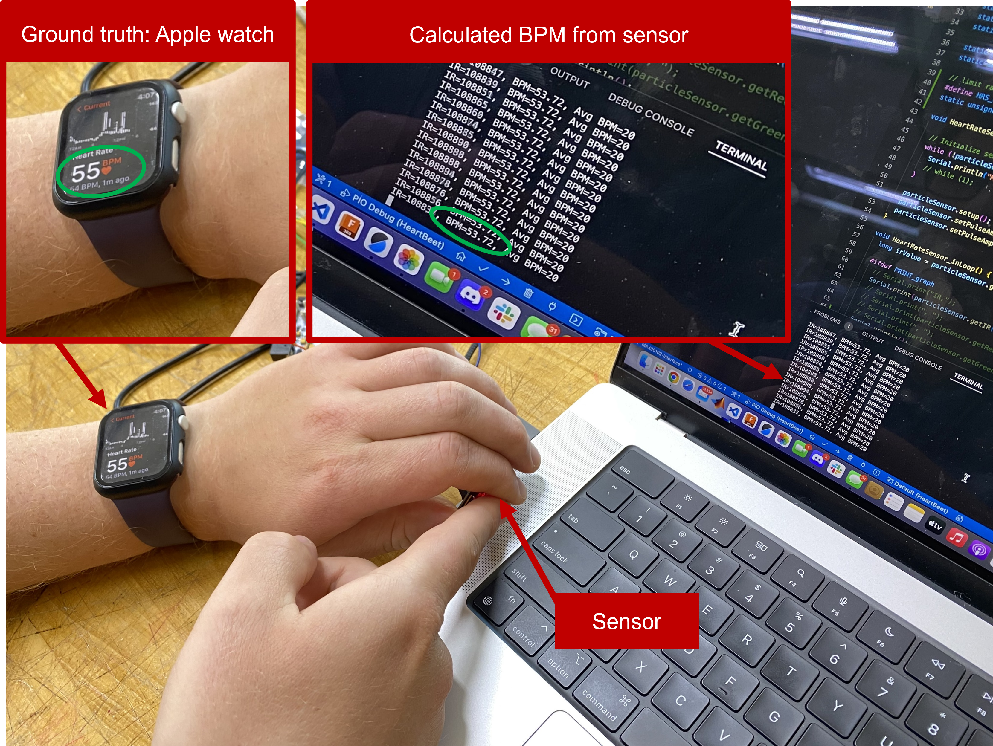 We conducted a short test to validate our calculated heart rate using the absorbance sensor (Figure A2). We found that the heart rate our device reported was accurate within approximately +/- 2 BPM when compared to the Apple watch. This is an acceptable error, given that the Apple watch likely averages over a number of heartbeats, and our device currently only reports the BPM based on the last beat time.