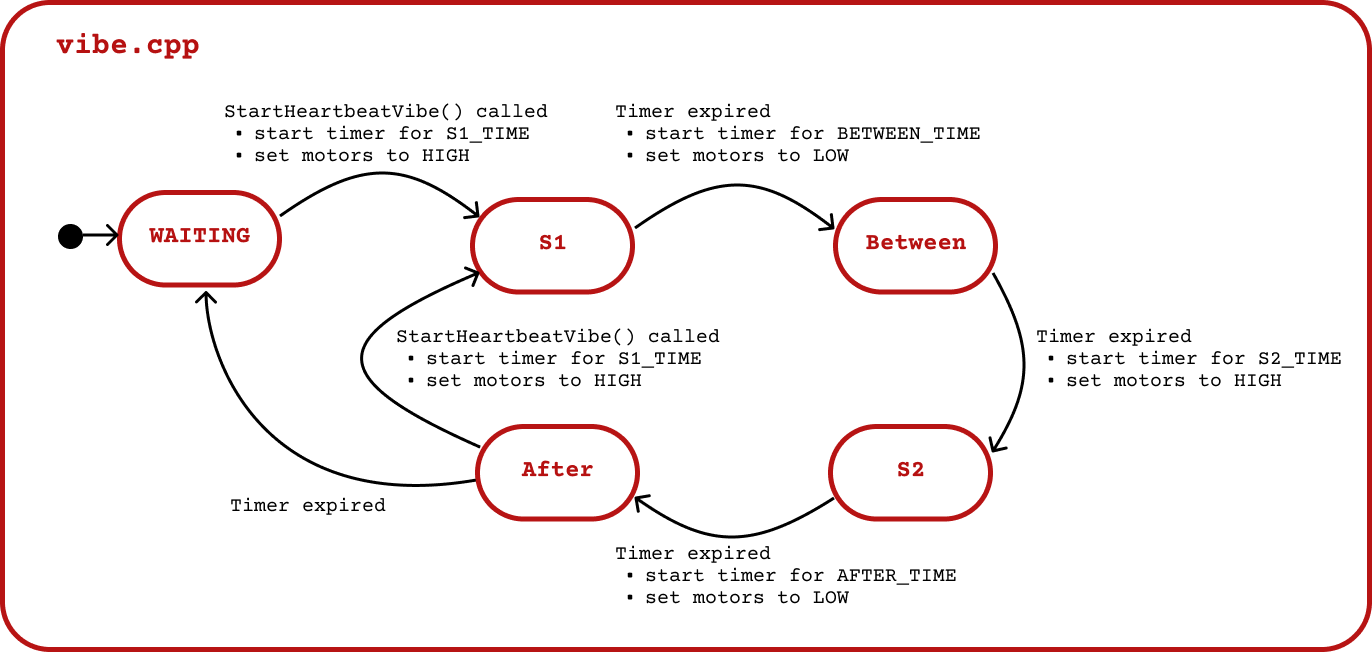 Vibration module. We wrote code to control the vibration motors so that we could have the device's user feel a "heart beat" that was created by the vibration motors. While the end effect is the same, this code needed to be more complex than our demonstration from a few weeks ago during our paper demonstration. This time, the vibration motor code needs to be non-blocking - in other words, we can't use delay() to time out the vibrations, and we also cannot assume each pass through loop() will take the same time, as we have other modules that may be doing things too (e.g. the heartbeat sensing module). Thus, we chose to use the arduino-timer library and a simple state machine that tracks the point in the heartbeat cycle we're in. This state diagram is shown below in Figure A3.