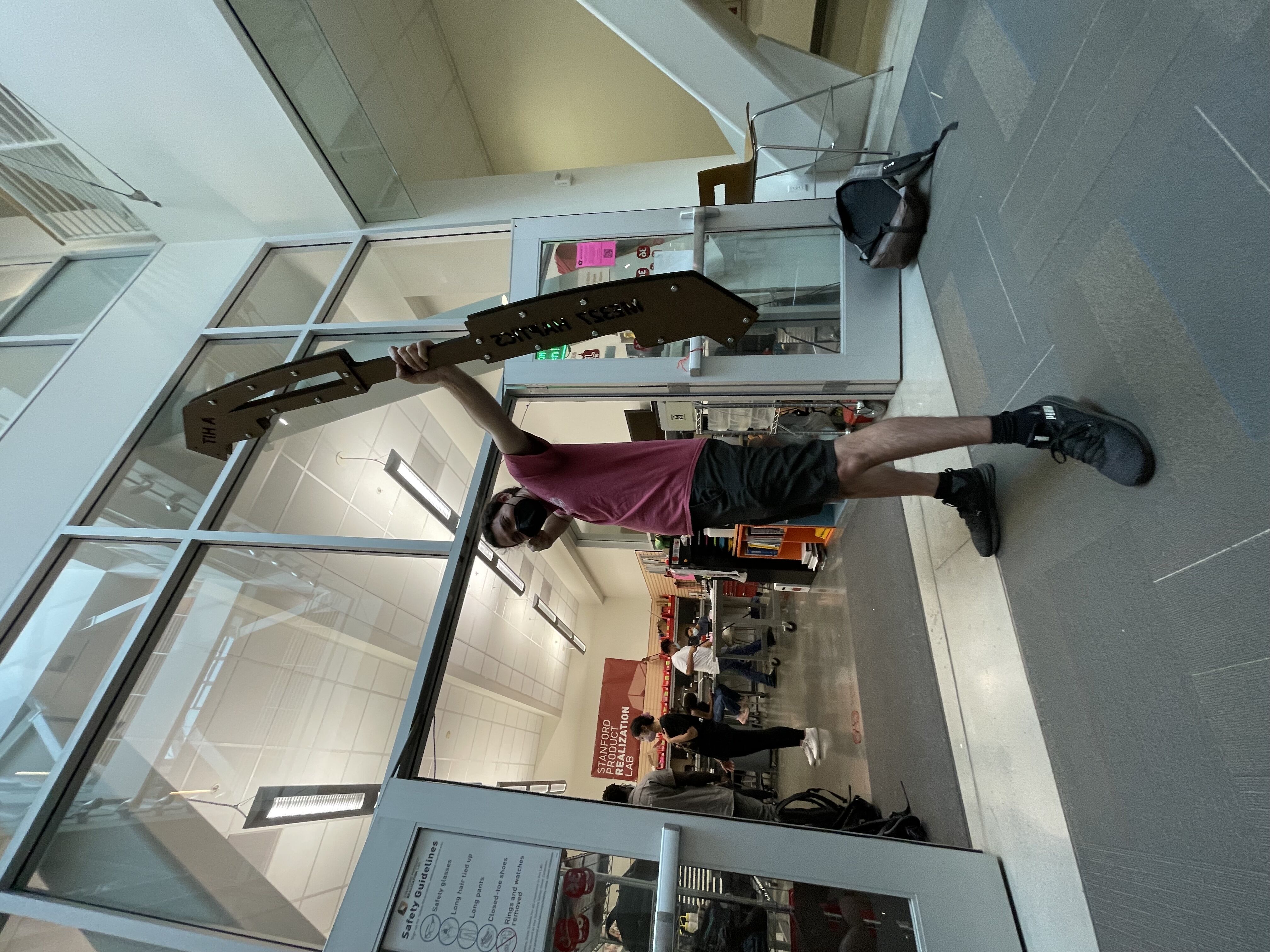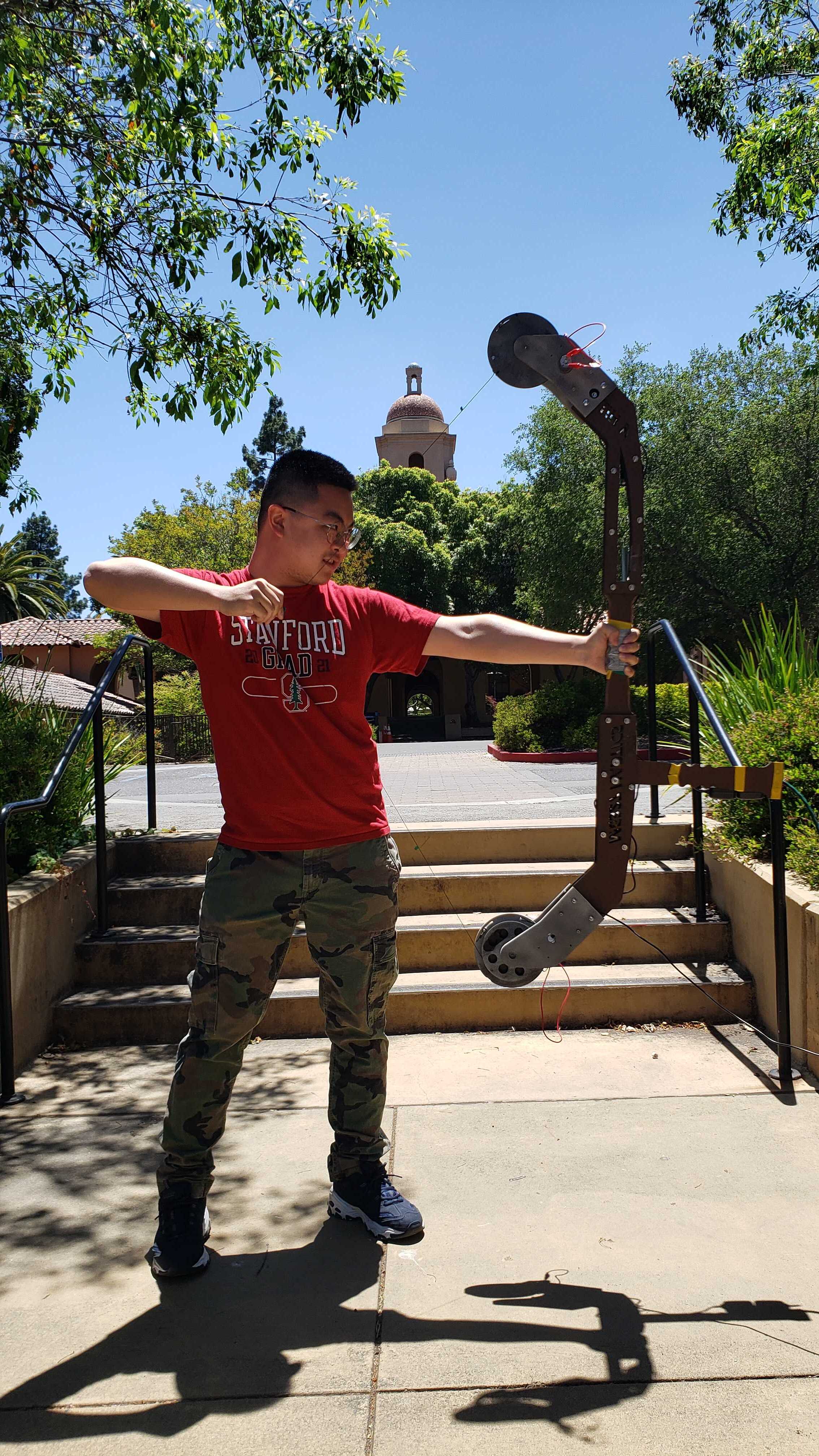 Its length and weight are slightly difficult to hold for some people based on our trials. We decided to scale it down for a more portable design, which is lighter with less materials, easier for users to hold the bow and draw the string simultaneously without the necessity of external supports. Will be laser cut the new parts and test again soon.